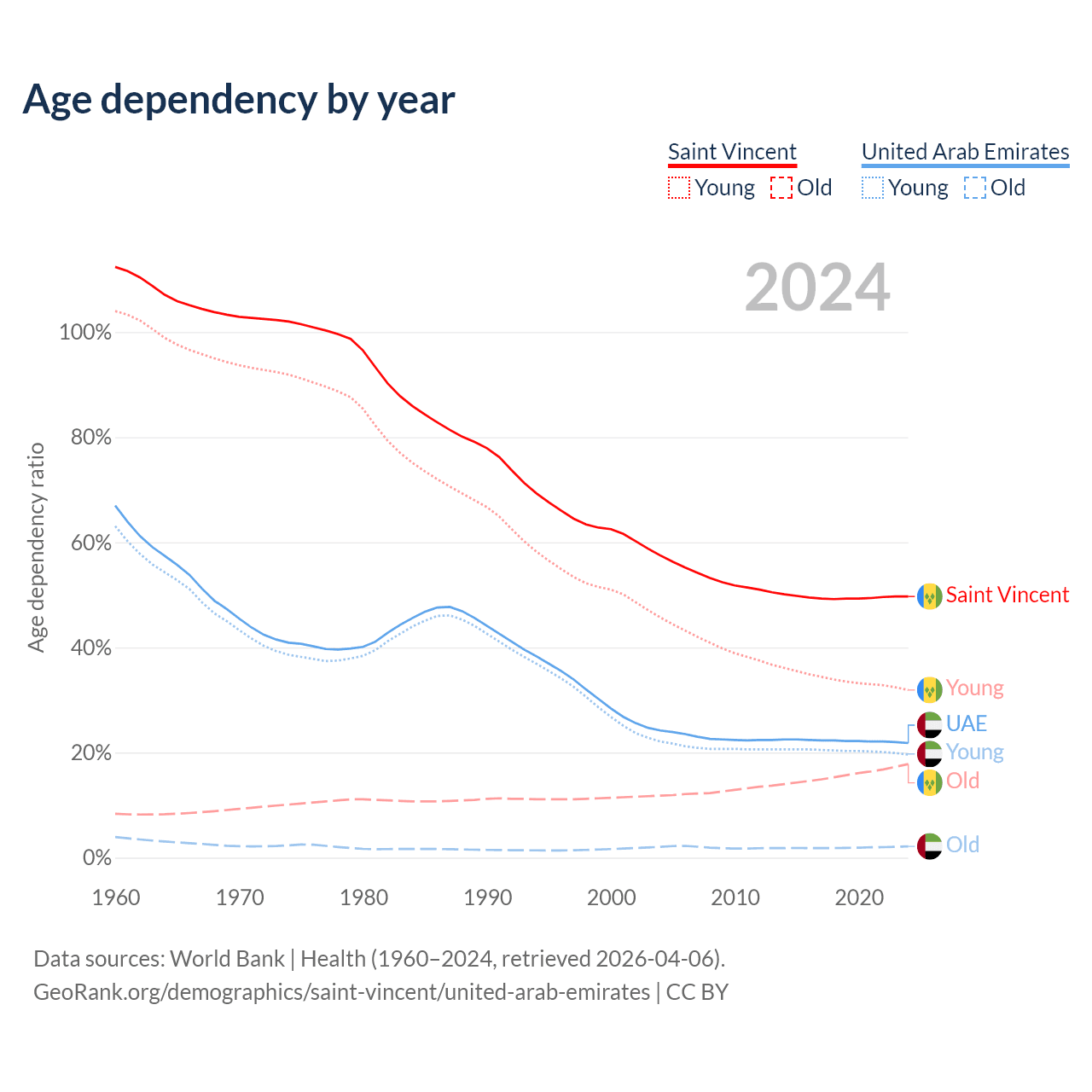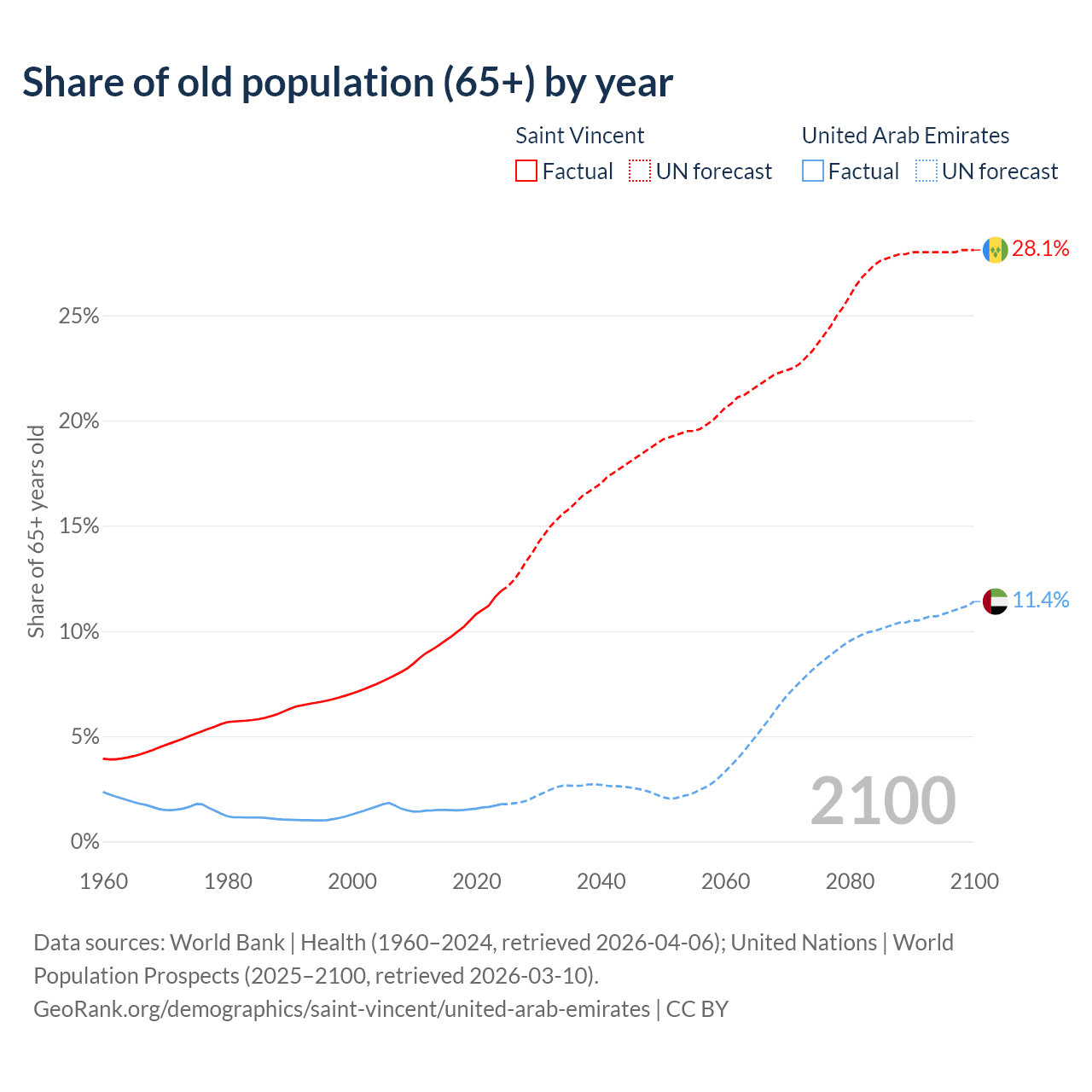 - The share of old-age demographic (65+) in Saint Vincent is 11.9% vs 1.77% in the United Arab Emirates.