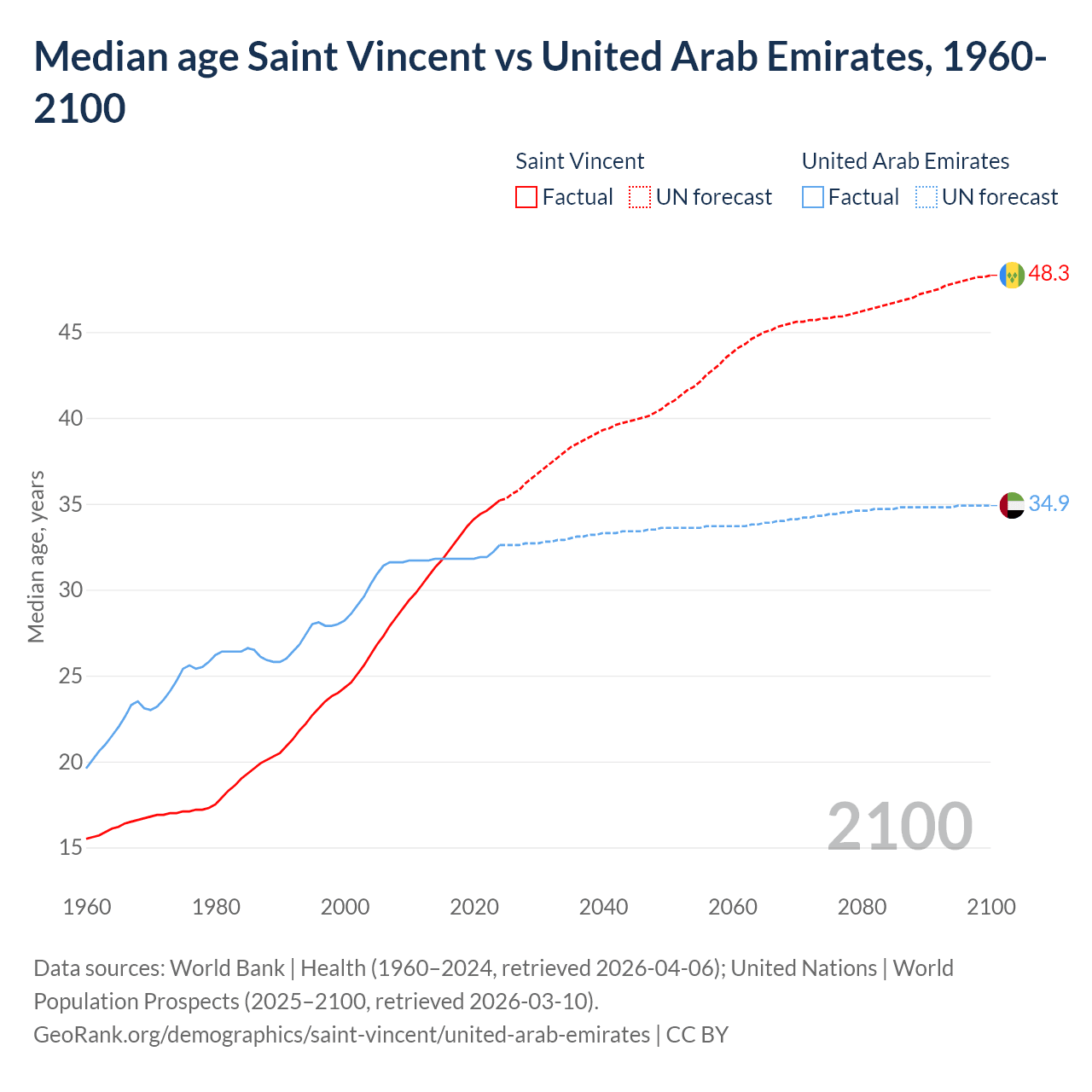 - The median age in Saint Vincent is 35.2 years compared to 32.6 years in the United Arab Emirates.