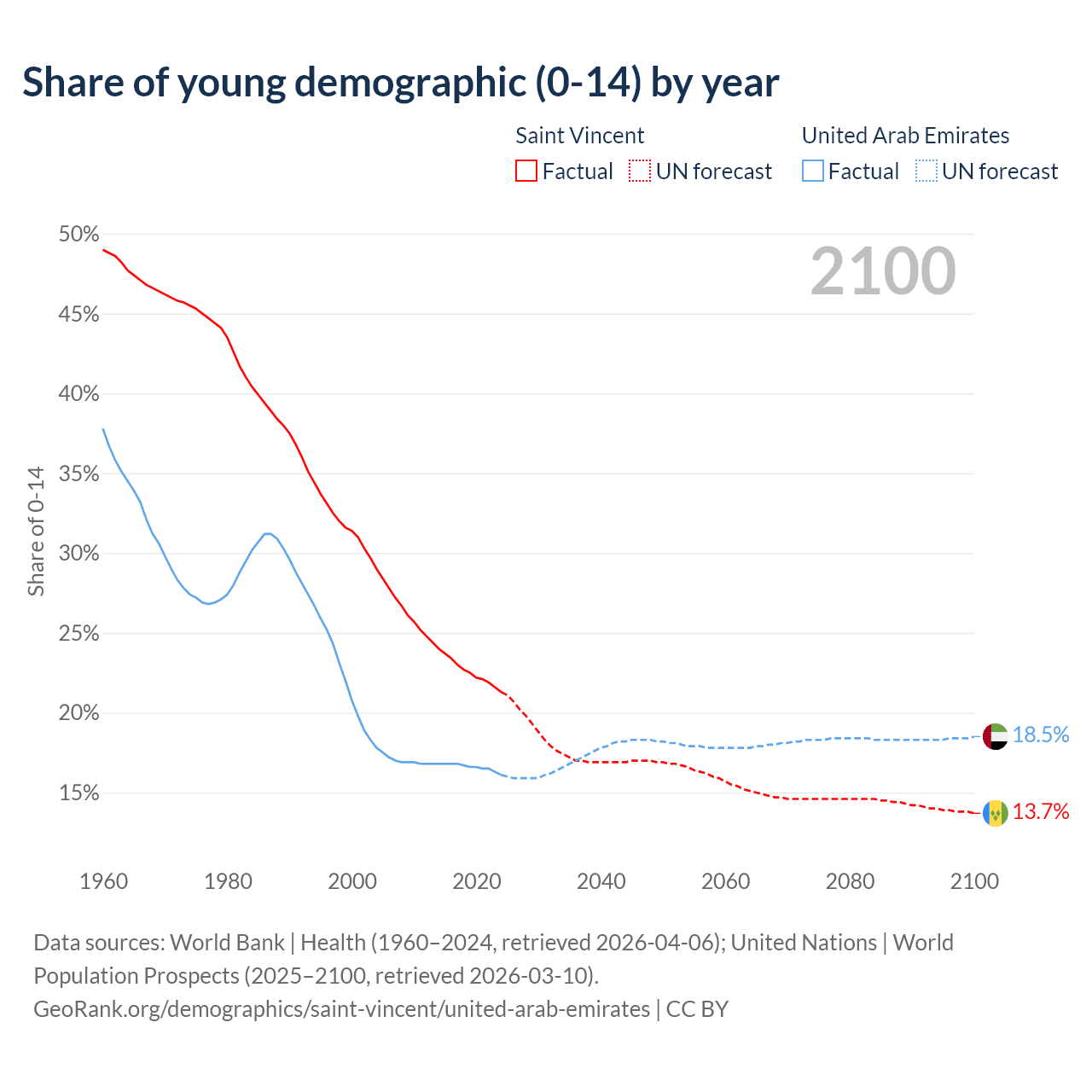 - The share of young demographic (0-15 years old) in Saint Vincent is 21.3% vs 16.1% in the United Arab Emirates.