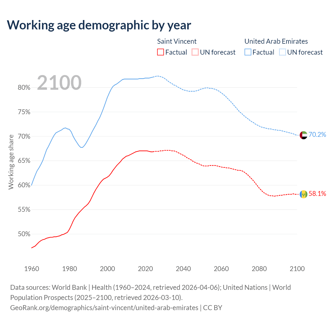 - Saint Vincent has 66.3K working age adults (aged 15-64) vs 9.6M in the United Arab Emirates.