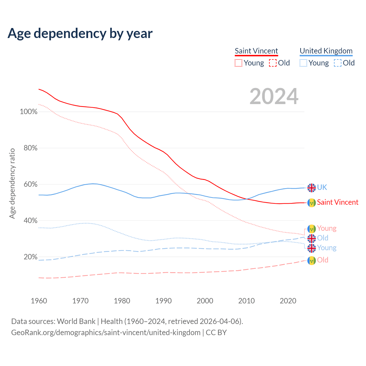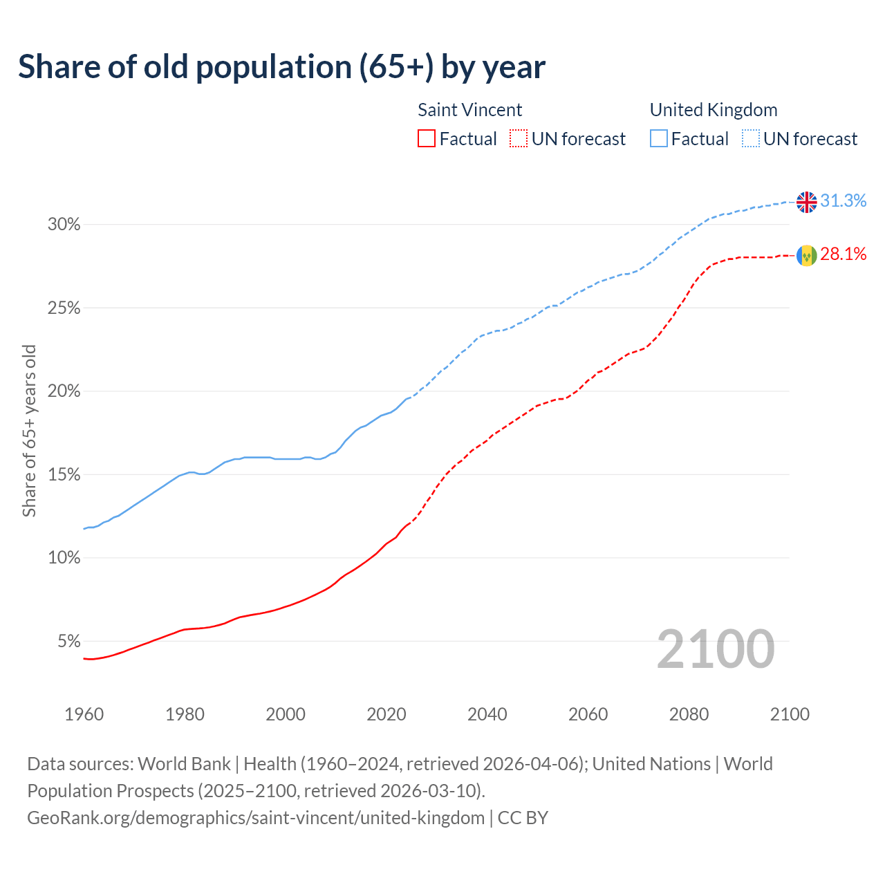 - The share of old-age demographic (65+) in Saint Vincent is 11.9% vs 19.5% in the United Kingdom.