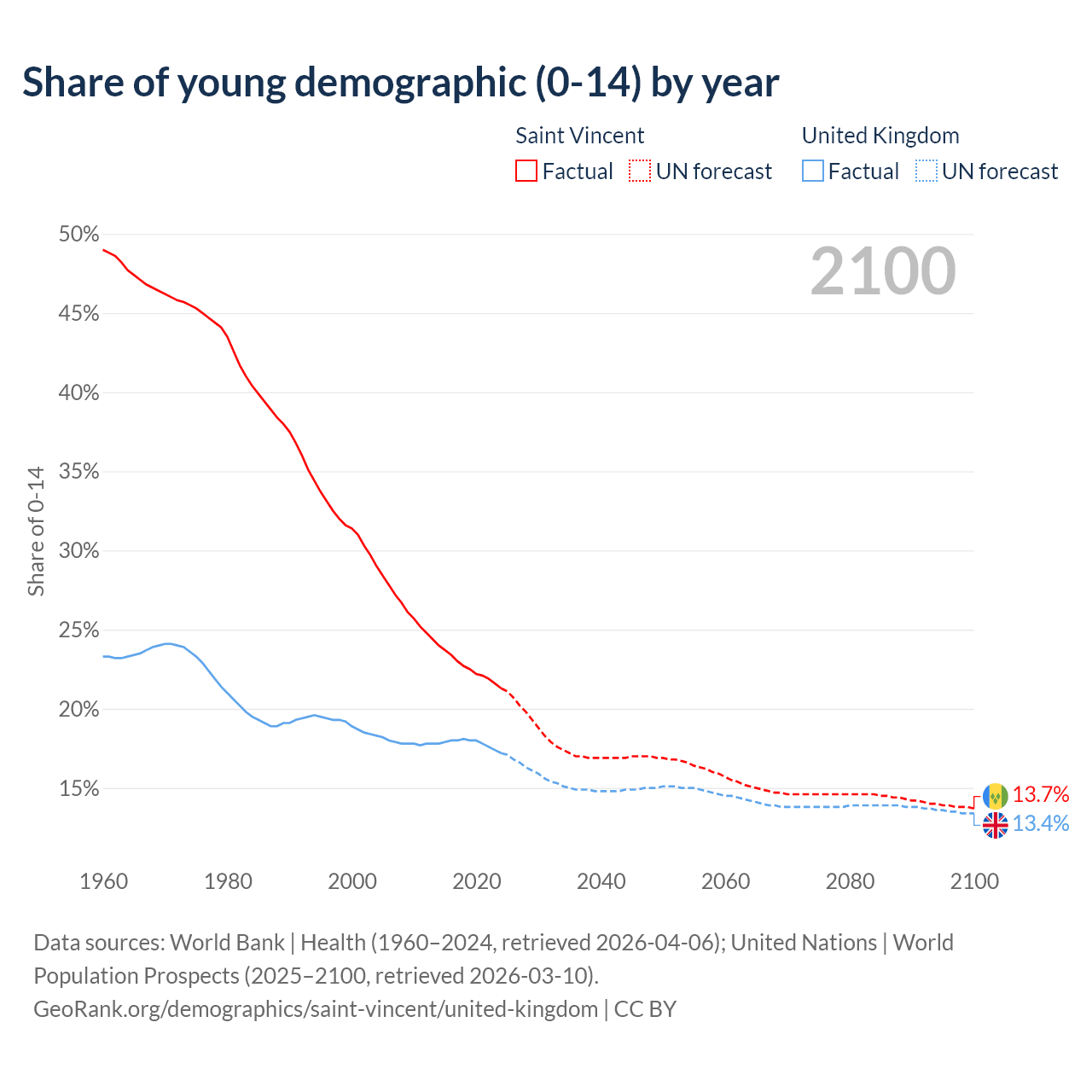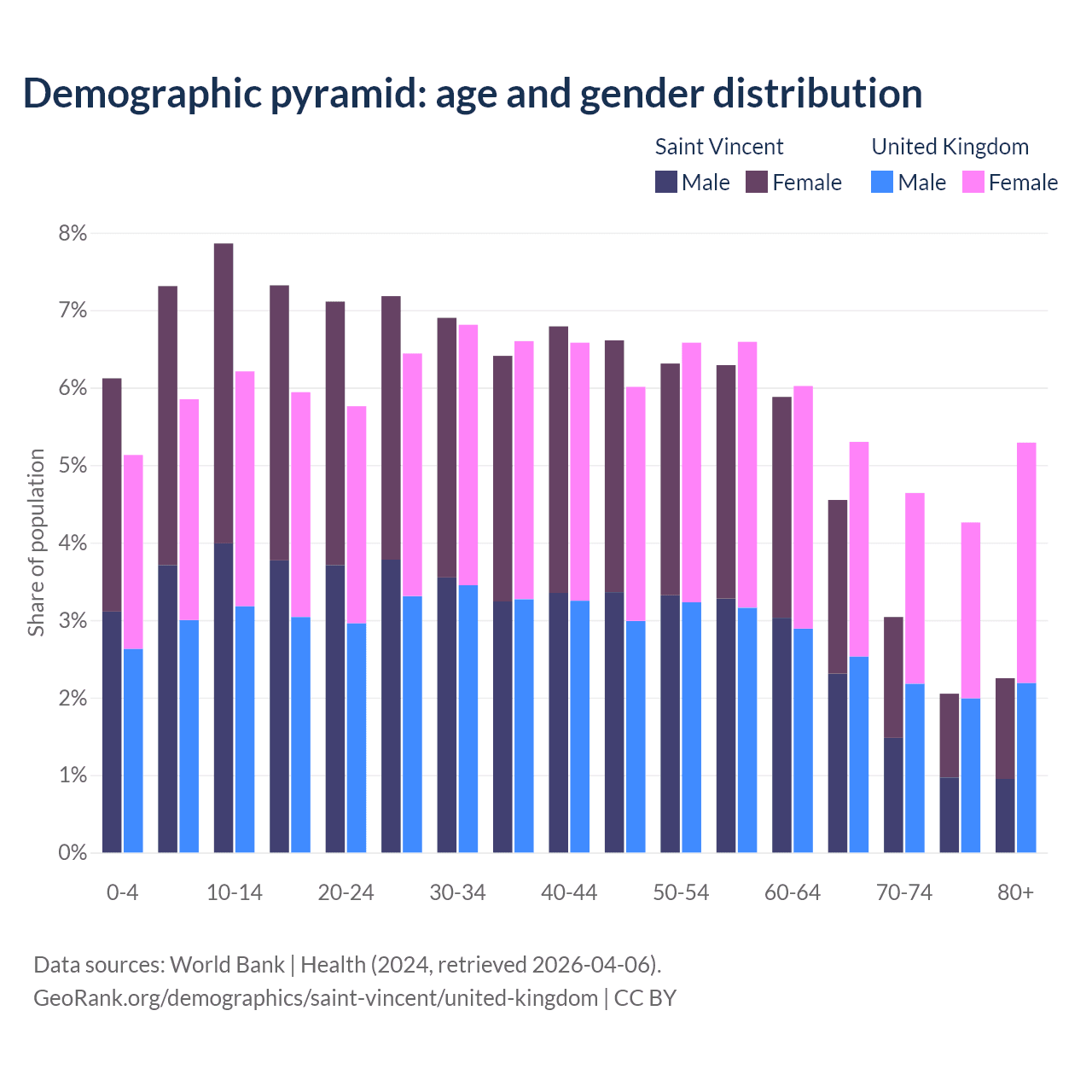 - The share of young demographic (0-15 years old) in Saint Vincent is 21.3% vs 17.2% in the United Kingdom.