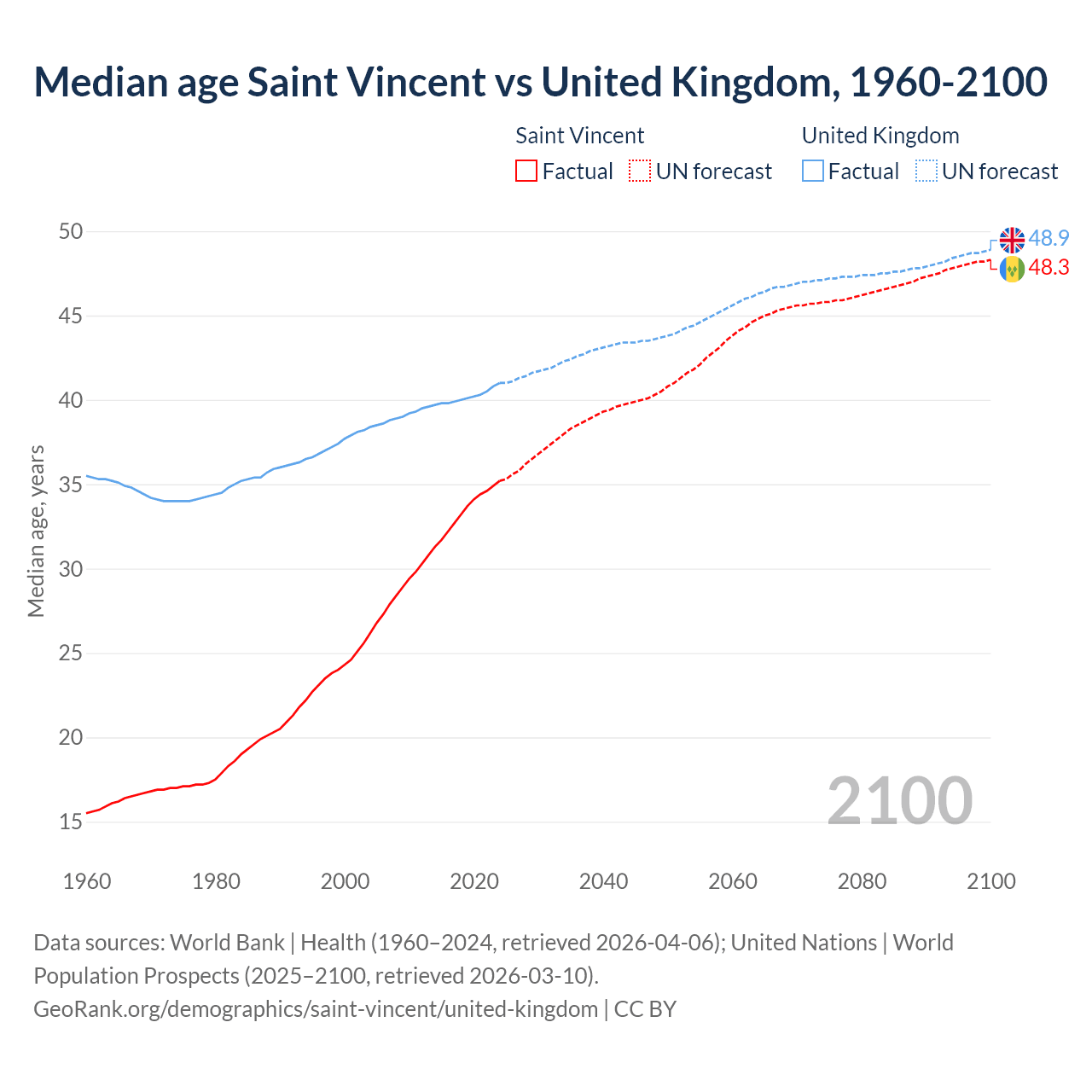 Median age Saint Vincent vs United Kingdom, 1960-2100