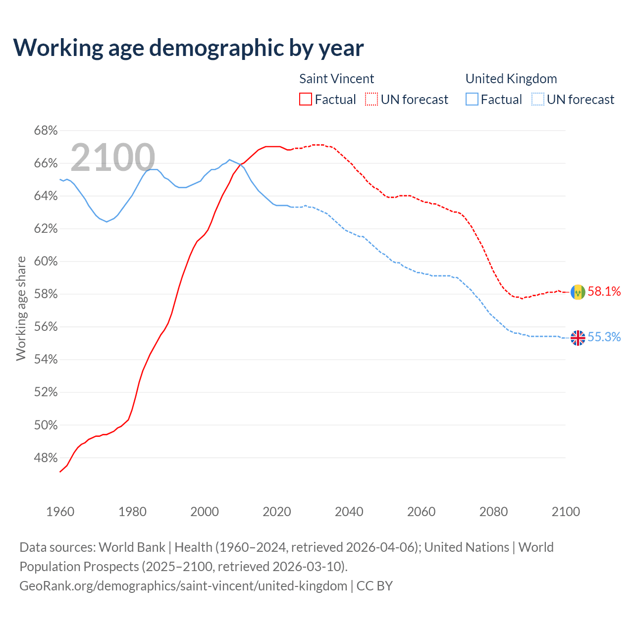 - Saint Vincent has 66.3K working age adults (aged 15-64) vs 44.4M in the United Kingdom.