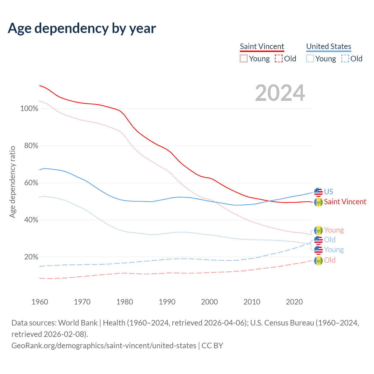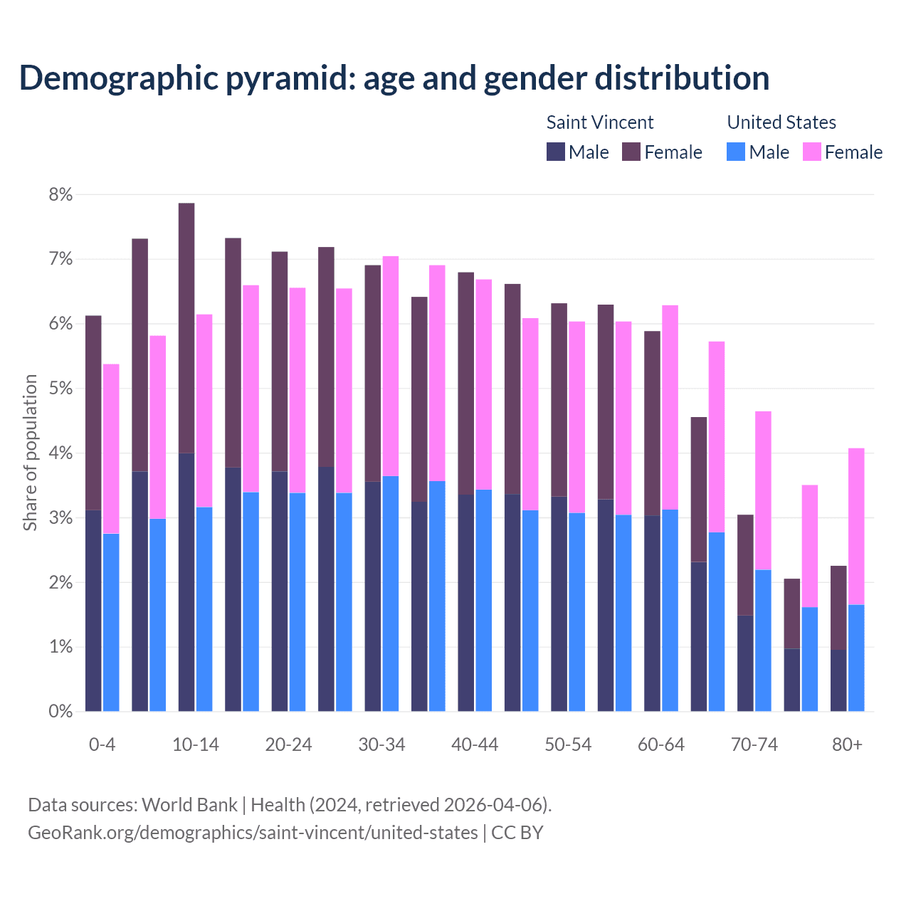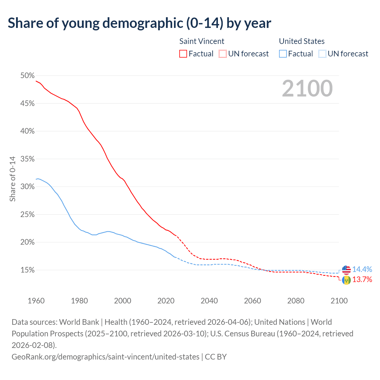 - The share of young demographic (0-15 years old) in Saint Vincent is 21.3% vs 17.3% in the United States.