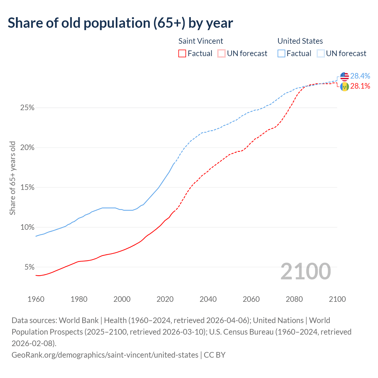 The share of older people aged 65 and over is 11.9% in Saint Vincent and 17.9% in the United States. Life expectancy in Saint Vincent compared to the United States .