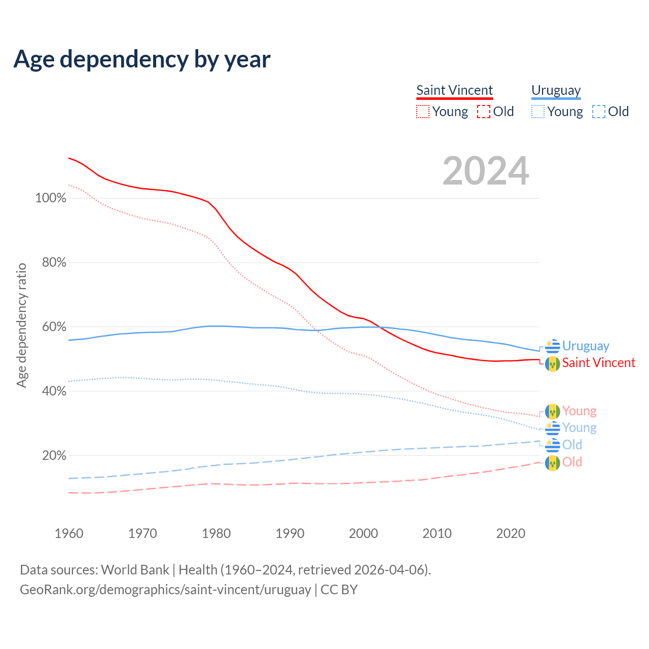 The share of older people aged 65 and over is 11.9% in Saint Vincent and 16% in Uruguay. Life expectancy in Saint Vincent compared to Uruguay .