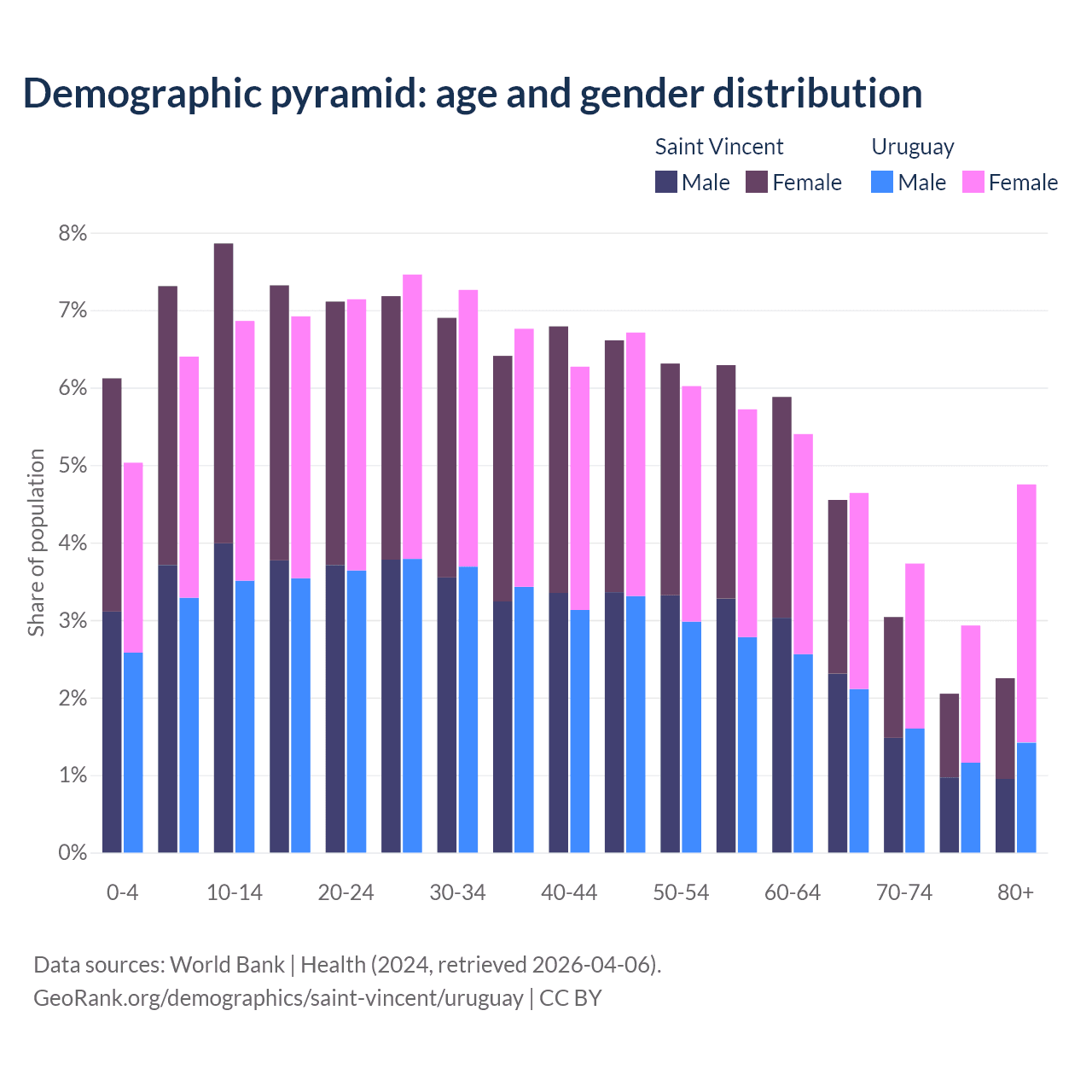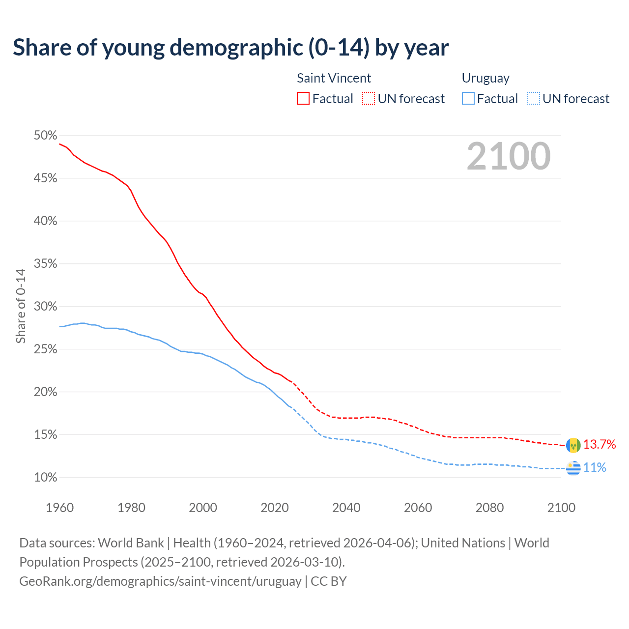 - The share of young demographic (0-15 years old) in Saint Vincent is 21.3% vs 18.3% in Uruguay.