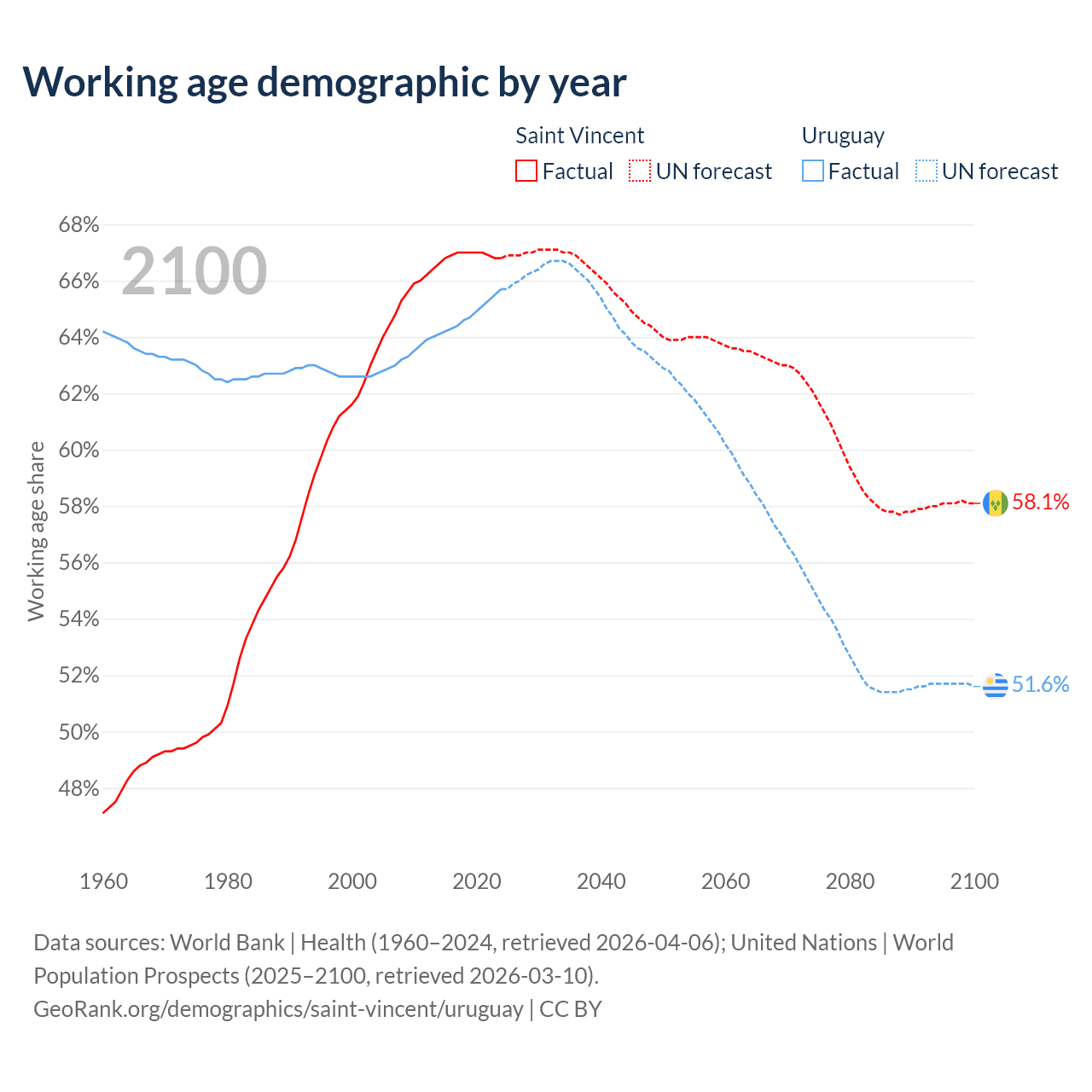 - Saint Vincent has 66.3K working age adults (aged 15-64) vs 2.22M in Uruguay.