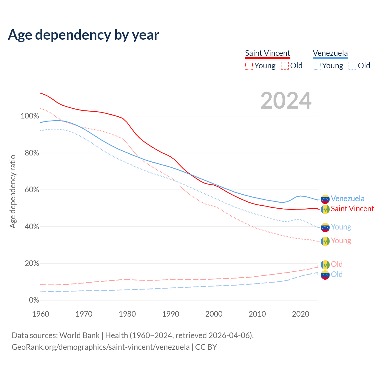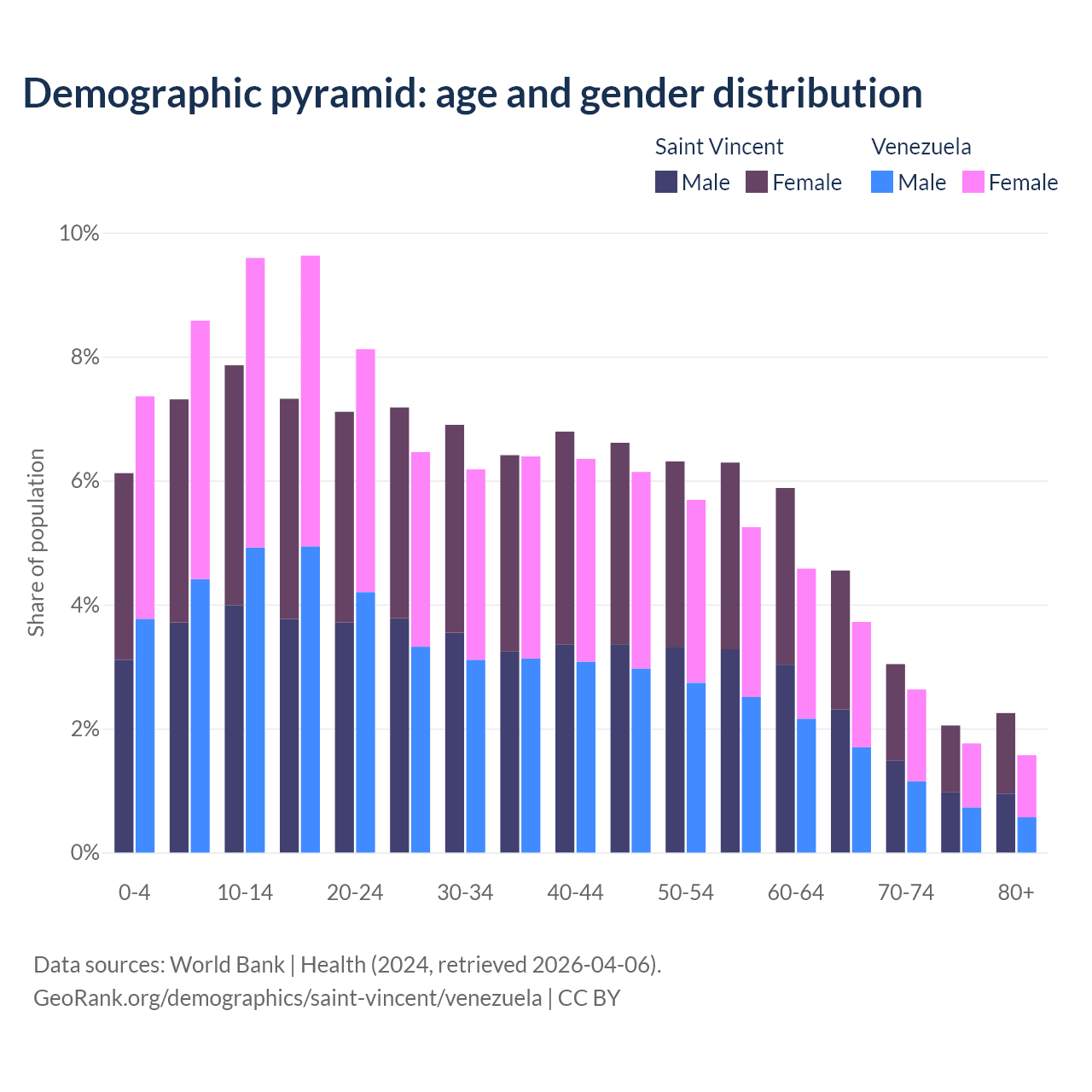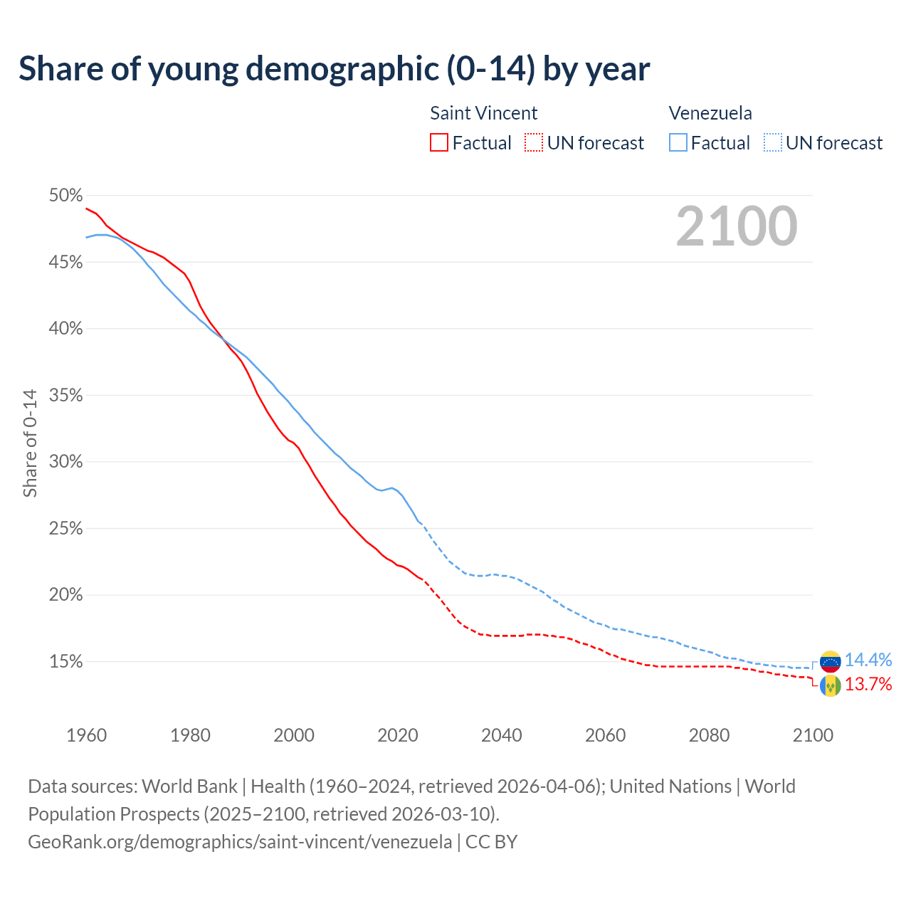 - The share of young demographic (0-15 years old) in Saint Vincent is 21.3% vs 25.5% in Venezuela.