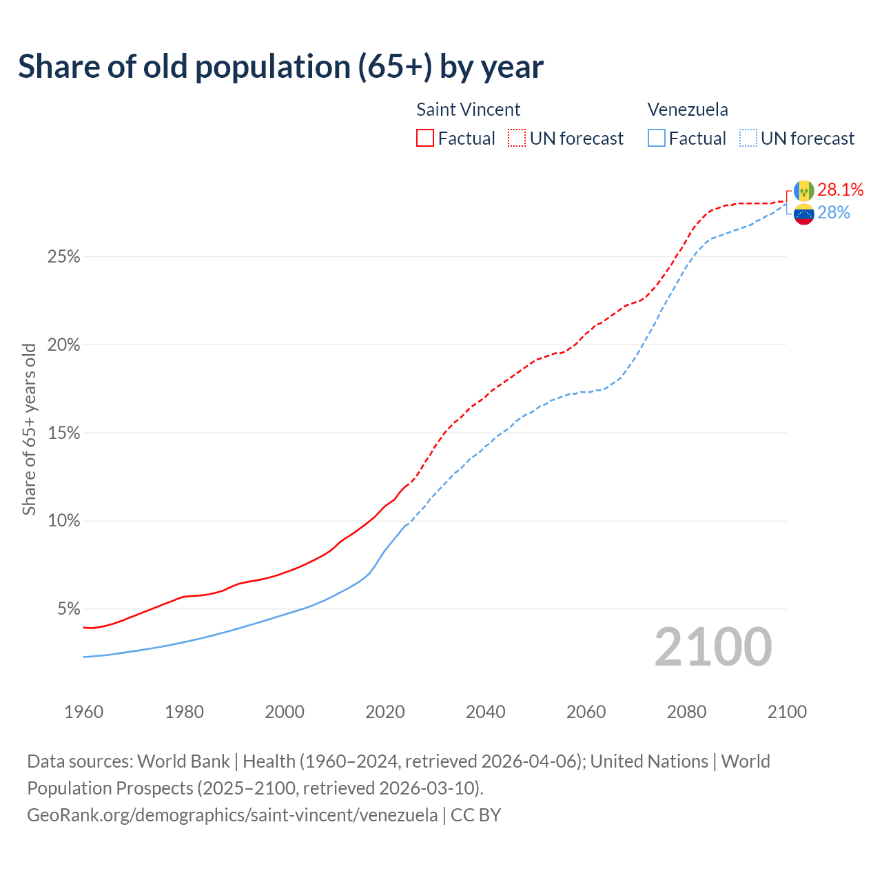 The share of older people aged 65 and over is 11.9% in Saint Vincent and 9.68% in Venezuela. Life expectancy in Saint Vincent compared to Venezuela .
