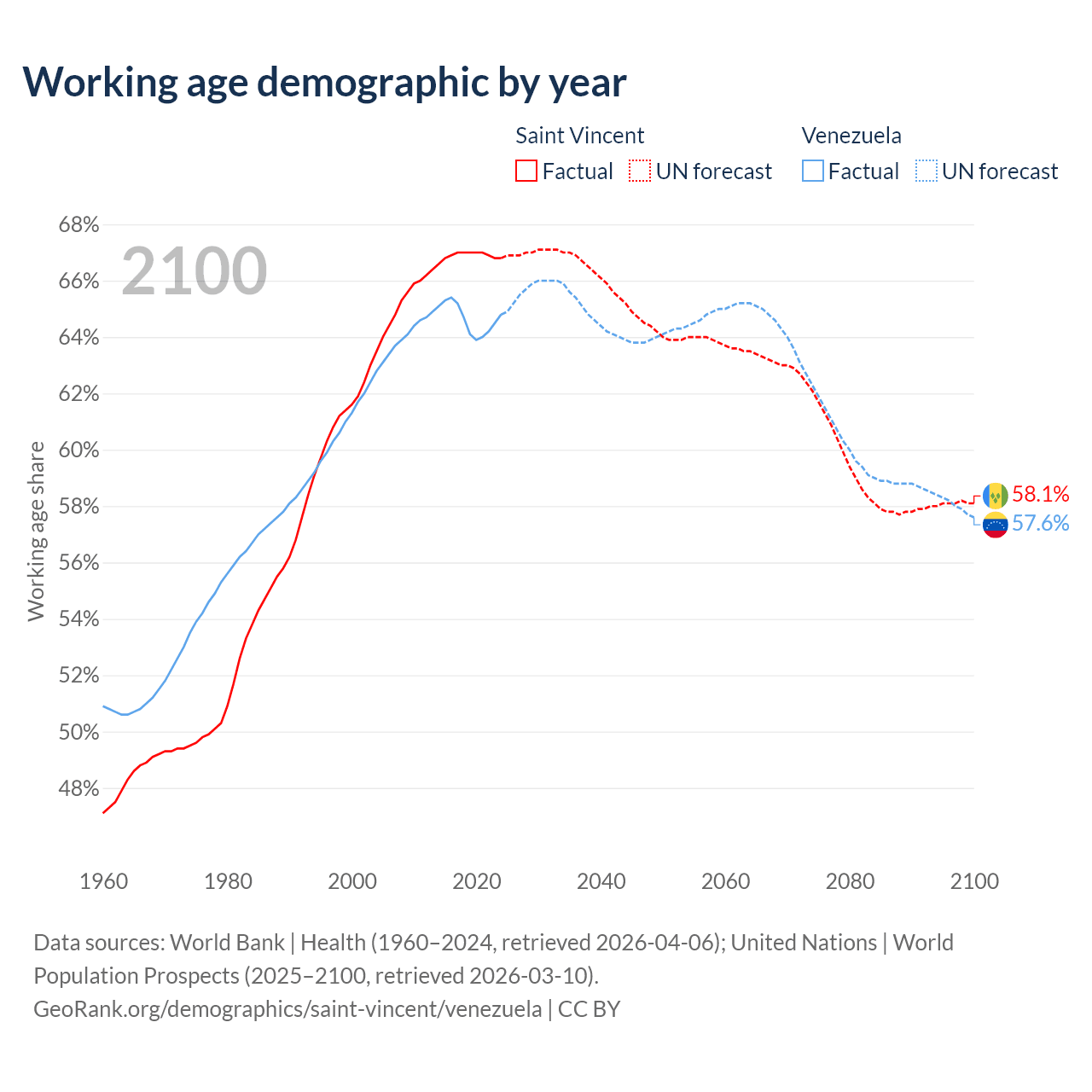 - Saint Vincent has 66.3K working age adults (aged 15-64) vs 18.6M in Venezuela.