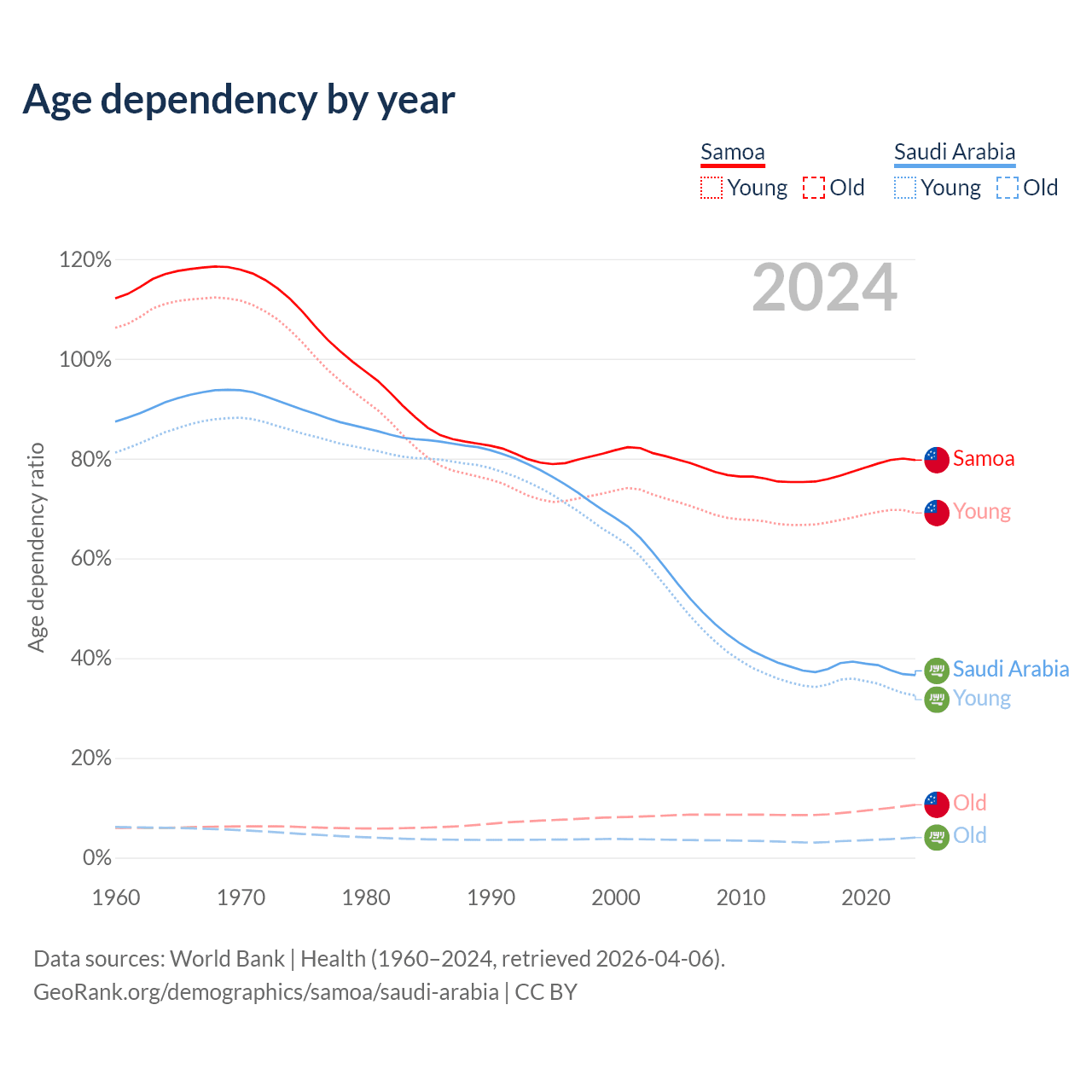 - Samoa is ranked 158/196 by median age (oldest to youngest) vs 98/196 for Saudi Arabia.