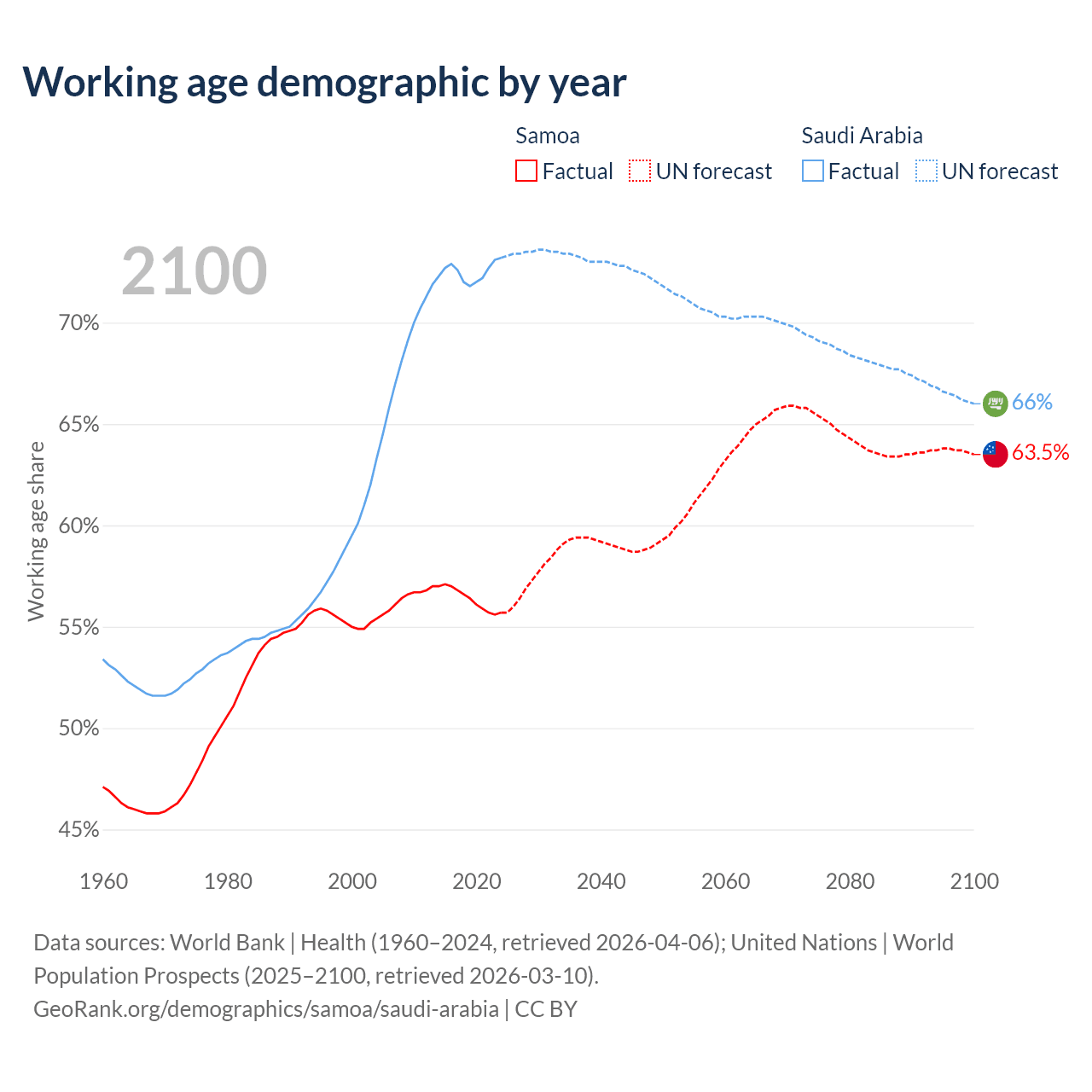 - The share of old-age demographic (65+) in Samoa is 5.88% vs 2.95% in Saudi Arabia.