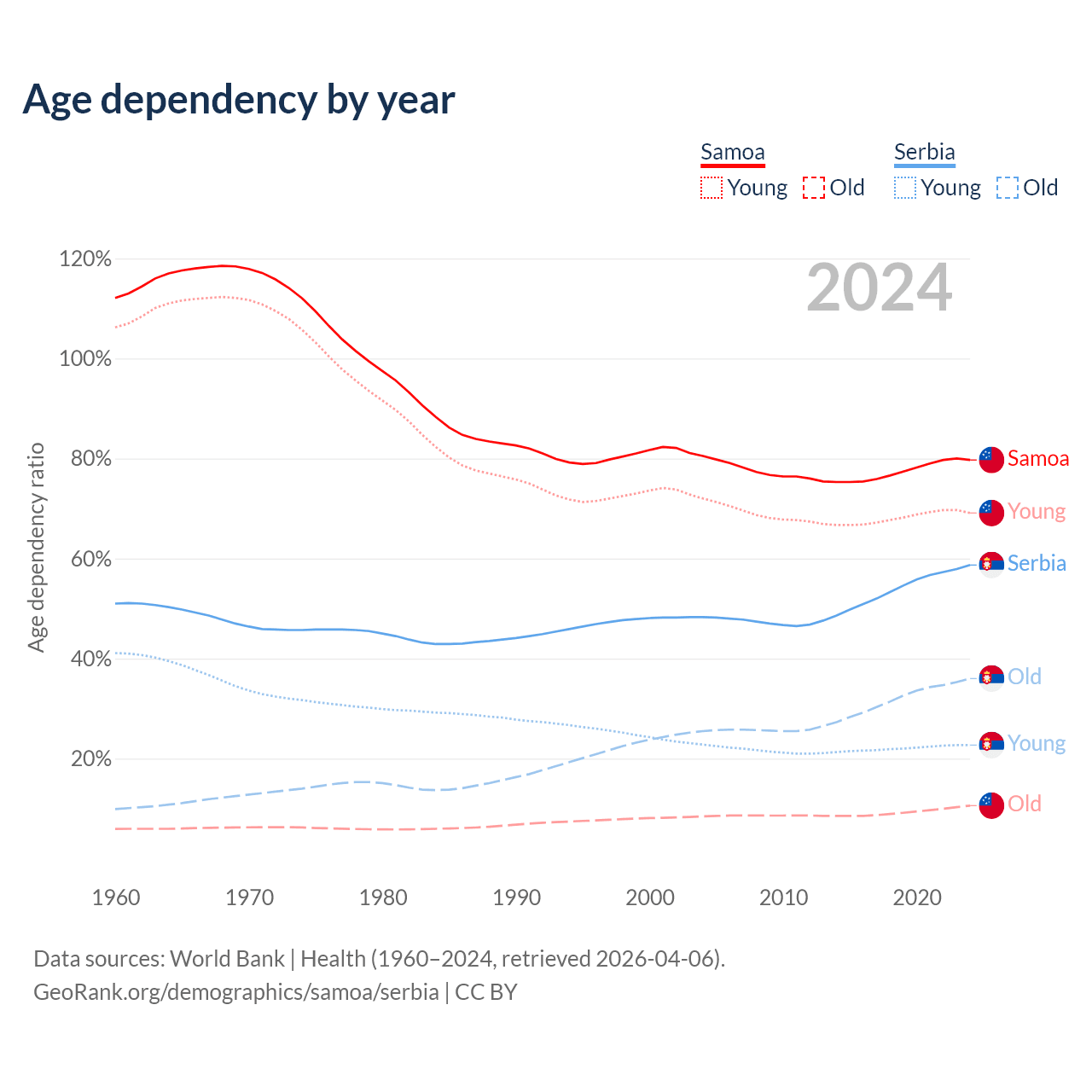 - Samoa is ranked 158/196 by median age (oldest to youngest) vs 15/196 for Serbia.