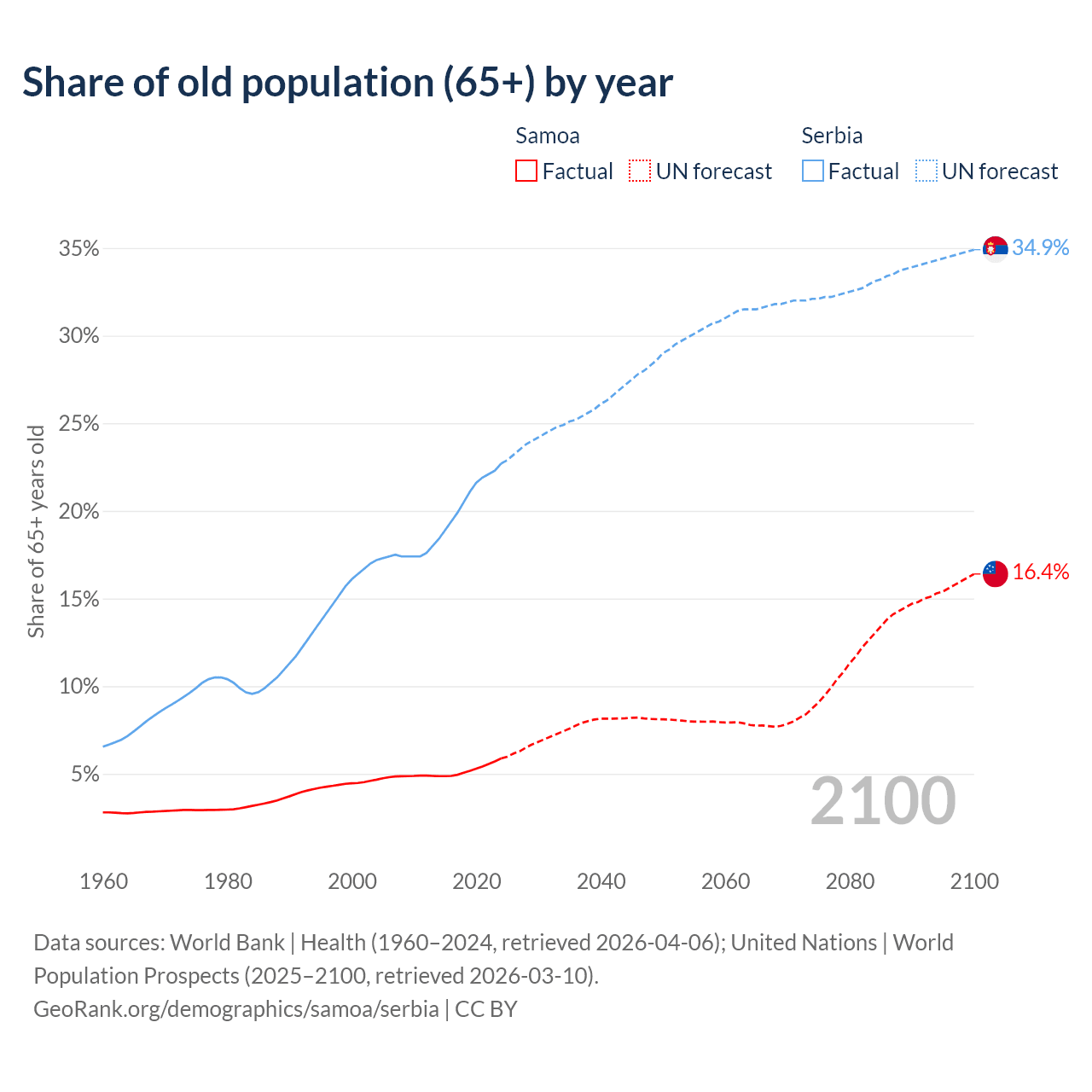 The share of older people aged 65 and over is 5.88% in Samoa and 22.7% in Serbia. Life expectancy in Samoa compared to Serbia .
