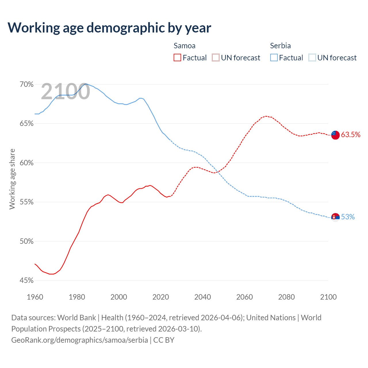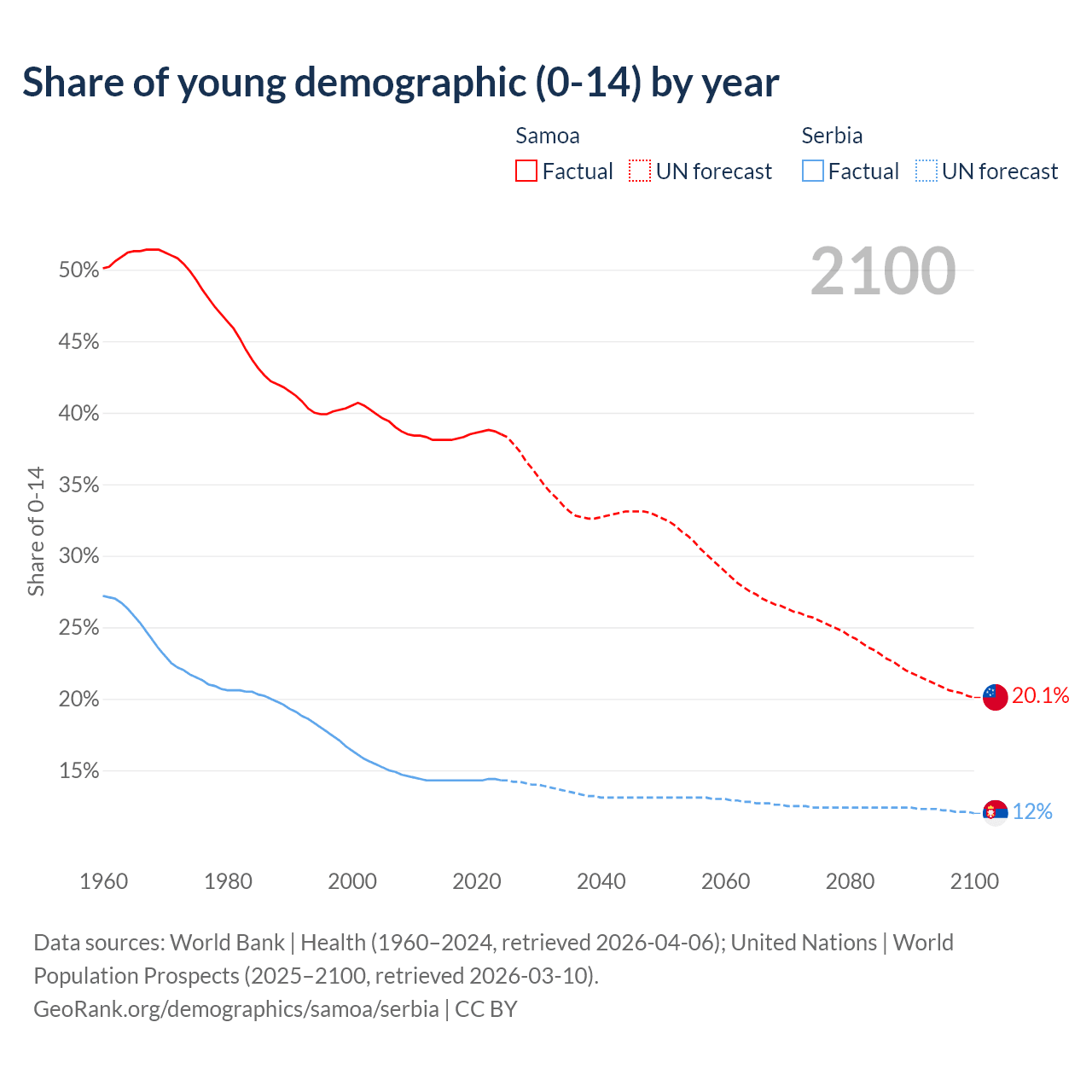 Median age Samoa vs Serbia, 1960-2100