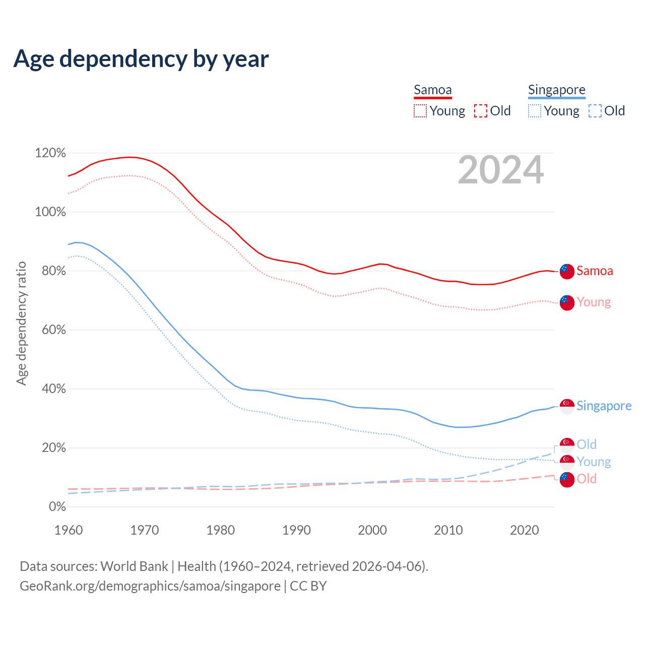 - Samoa is ranked 158/196 by median age (oldest to youngest) vs 68/196 for Singapore.
