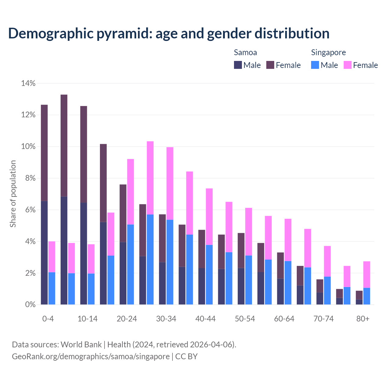 - The share of old-age demographic (65+) in Samoa is 5.88% vs 13.7% in Singapore.