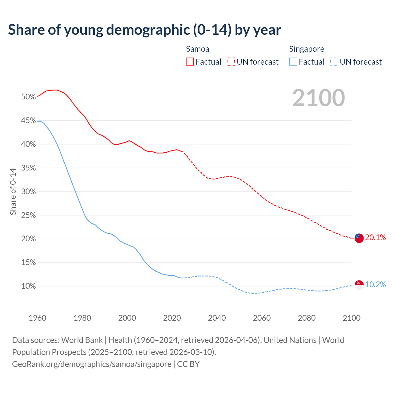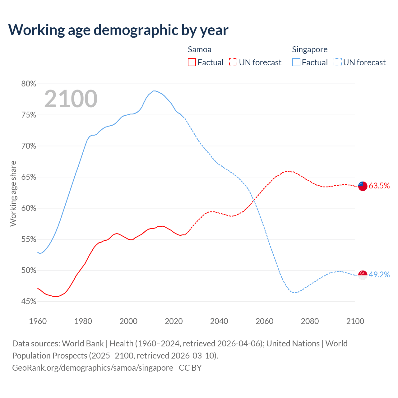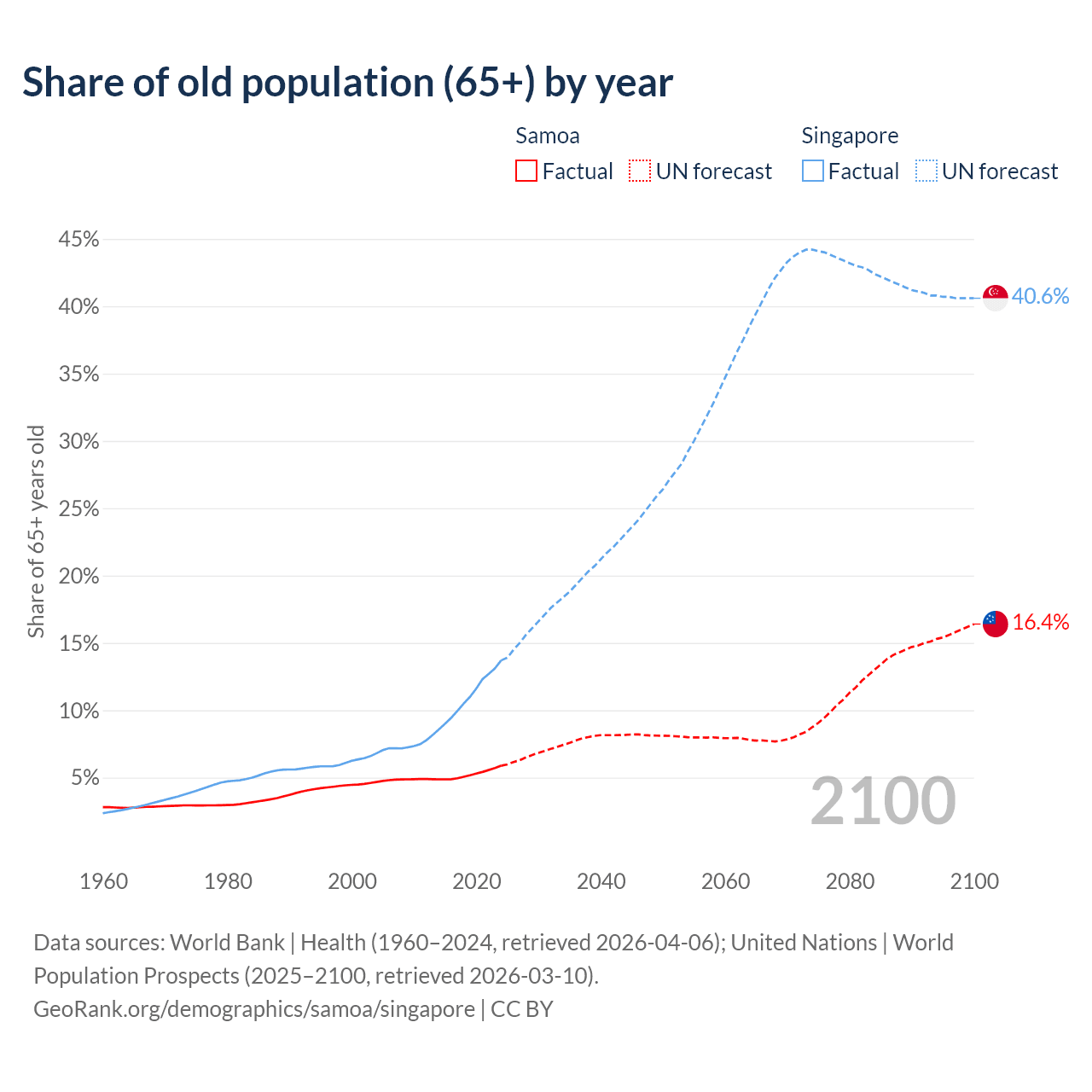 Median age Samoa vs Singapore, 1960-2100