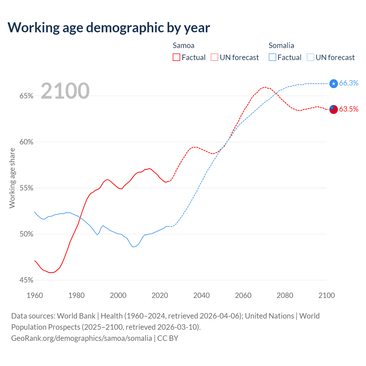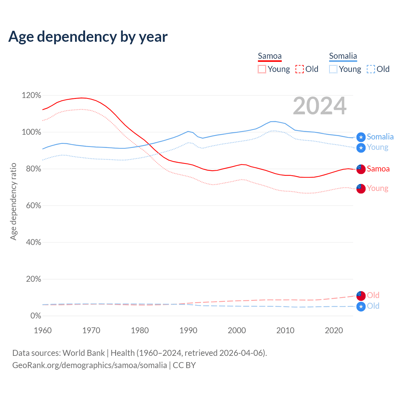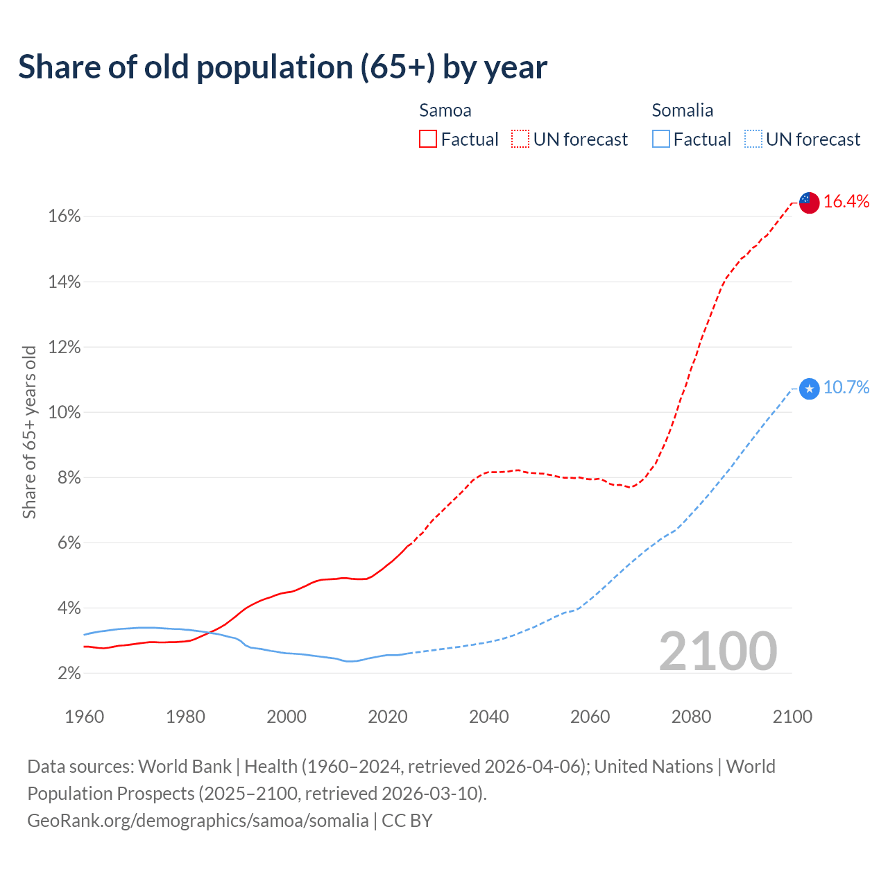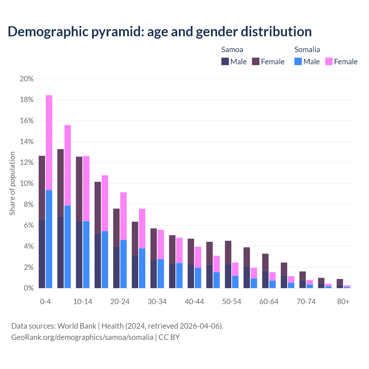- The share of old-age demographic (65+) in Samoa is 5.88% vs 2.59% in Somalia.