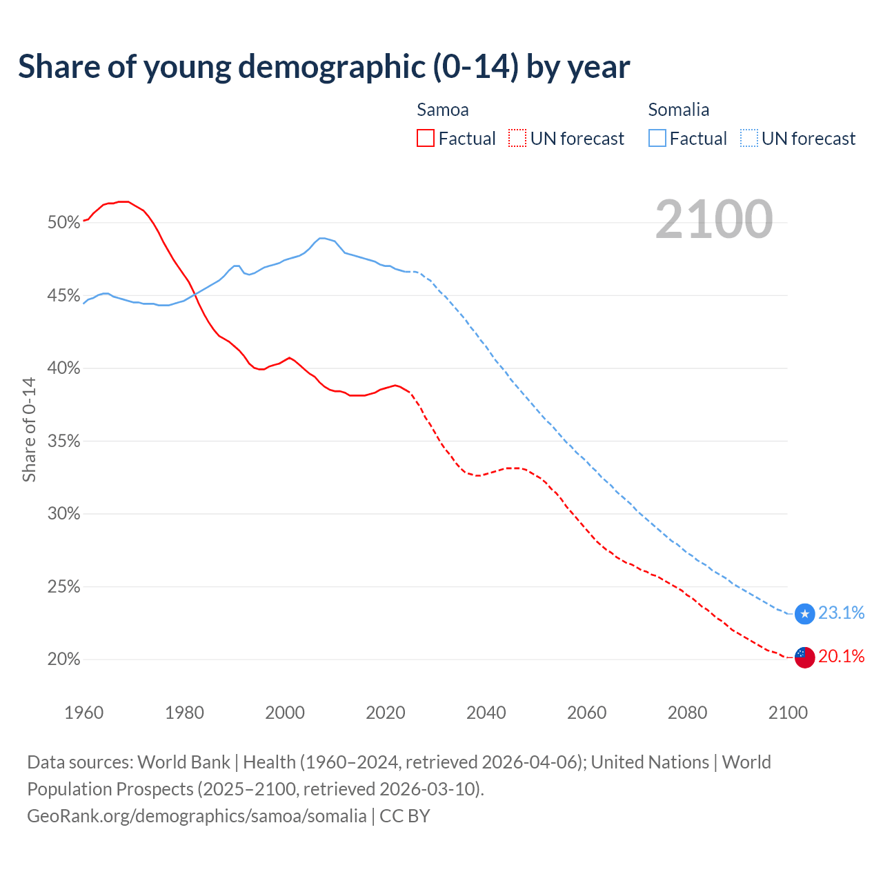 - The share of young demographic (0-15 years old) in Samoa is 38.5% vs 46.6% in Somalia.