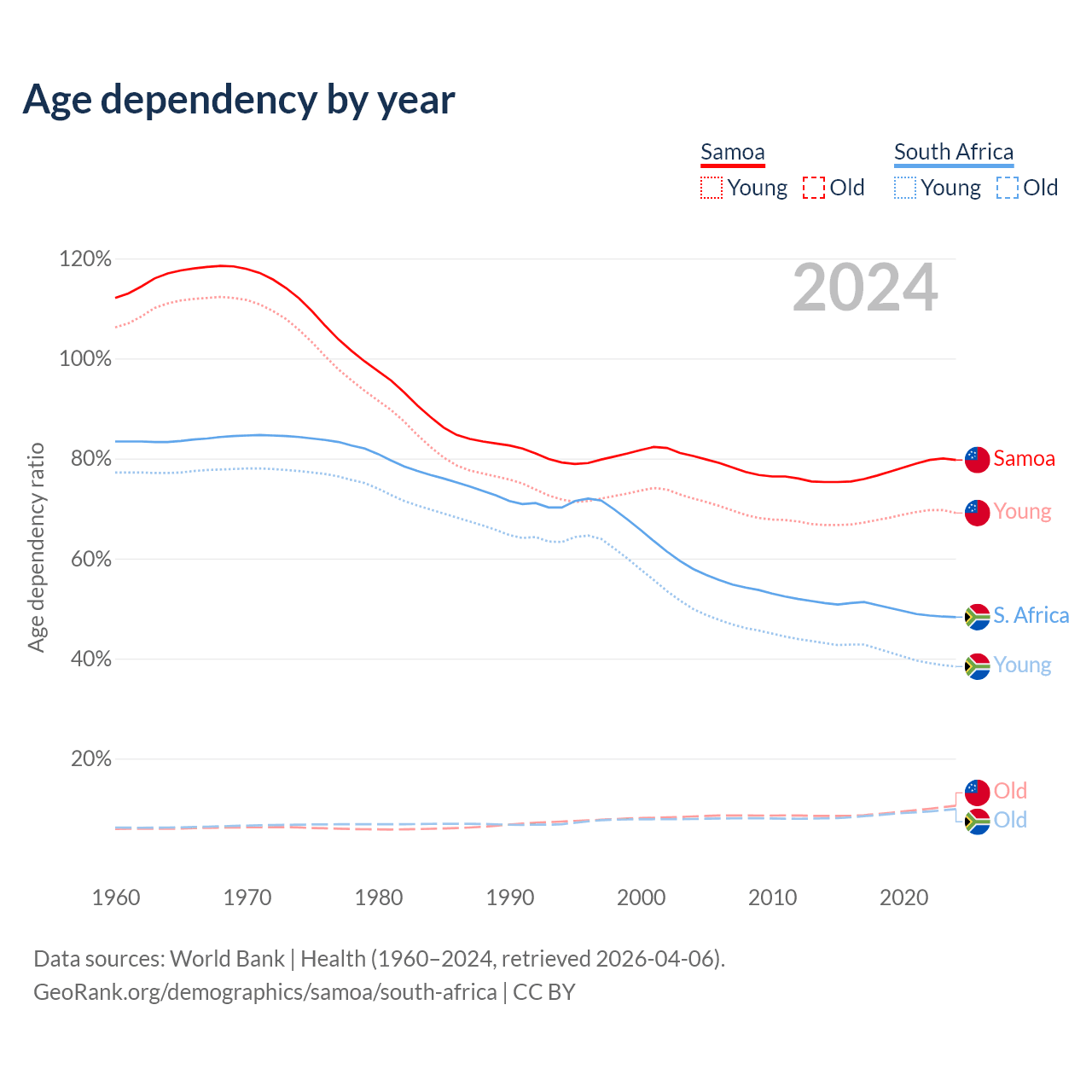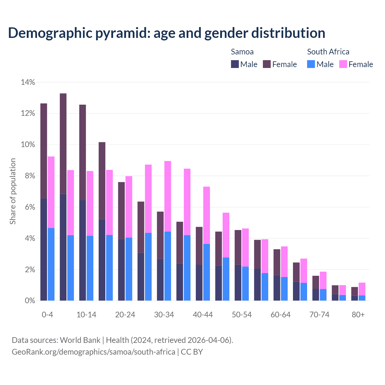- Samoa is ranked 158/196 by median age (oldest to youngest) vs 107/196 for South Africa.