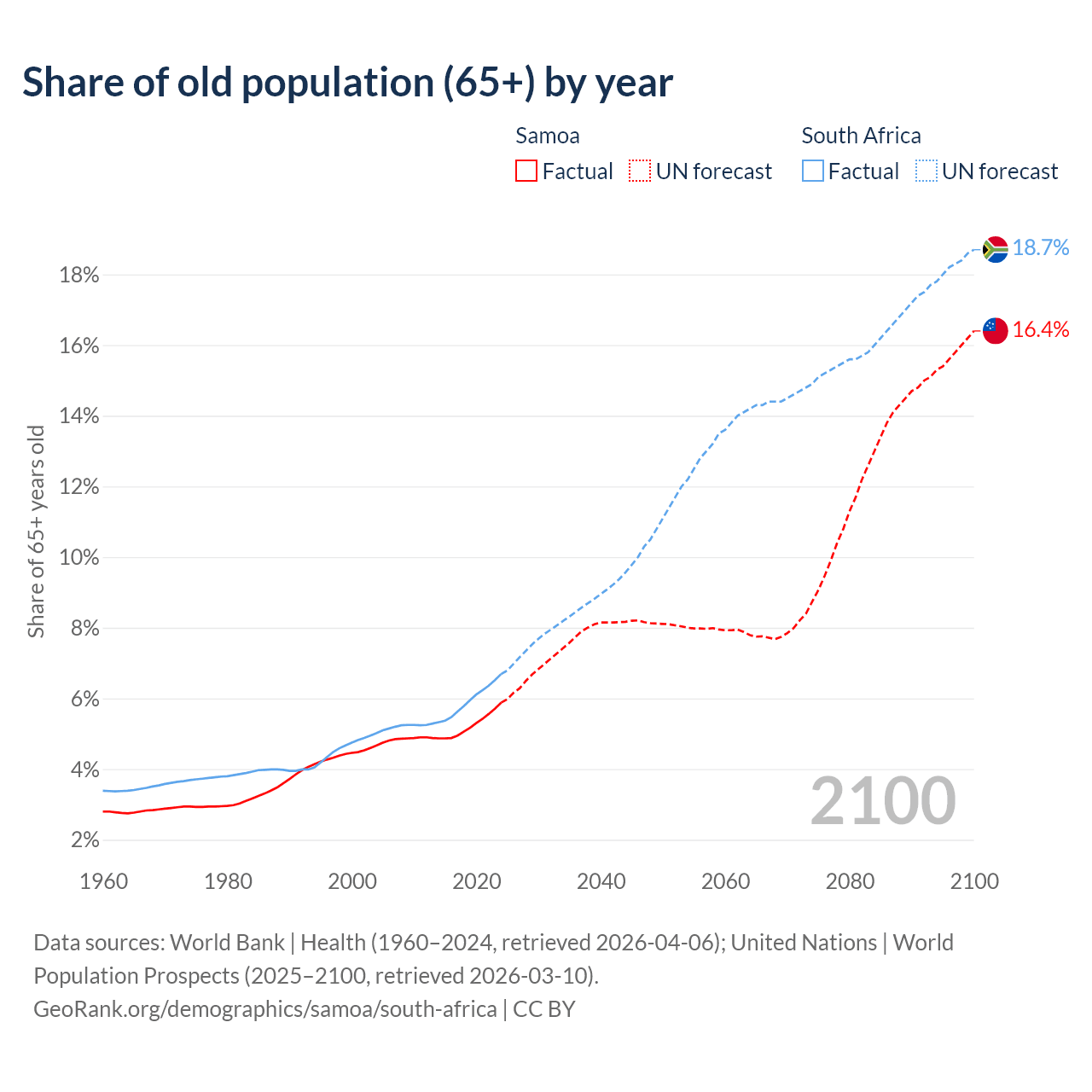- The share of old-age demographic (65+) in Samoa is 5.88% vs 6.69% in South Africa.