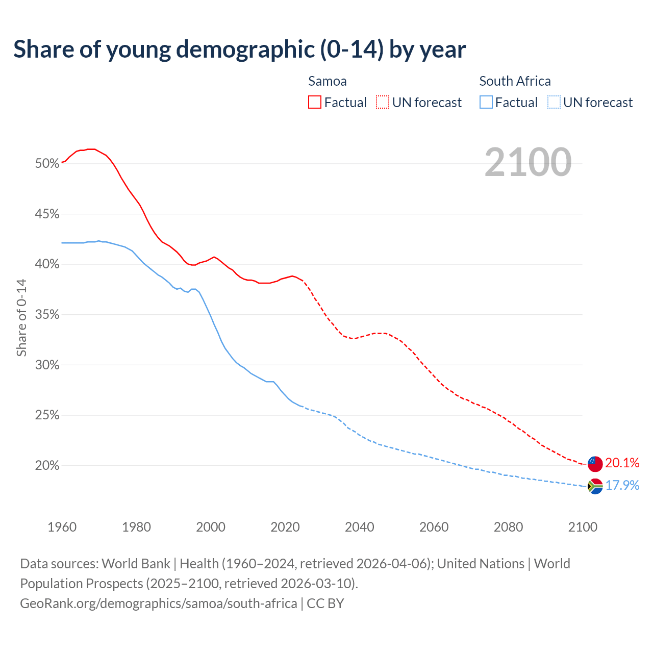 - The share of young demographic (0-15 years old) in Samoa is 38.5% vs 25.9% in South Africa.