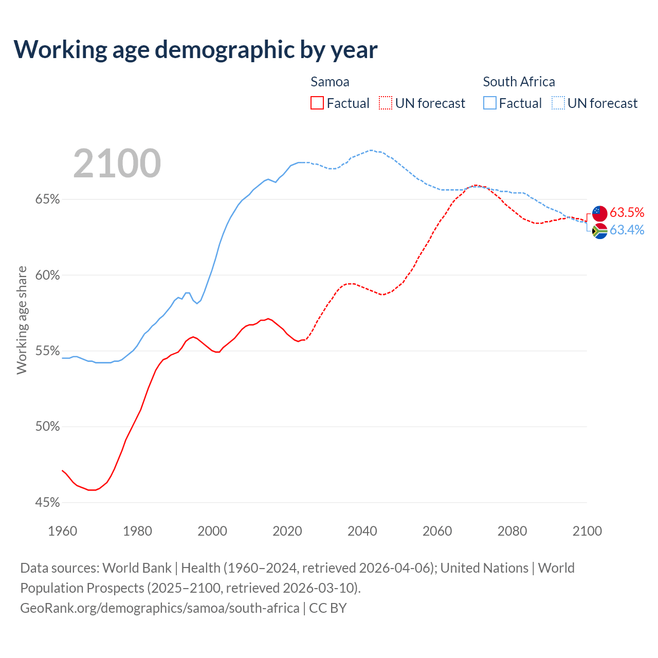 - Samoa has 123K working age adults (aged 15-64) vs 44.3M in South Africa.