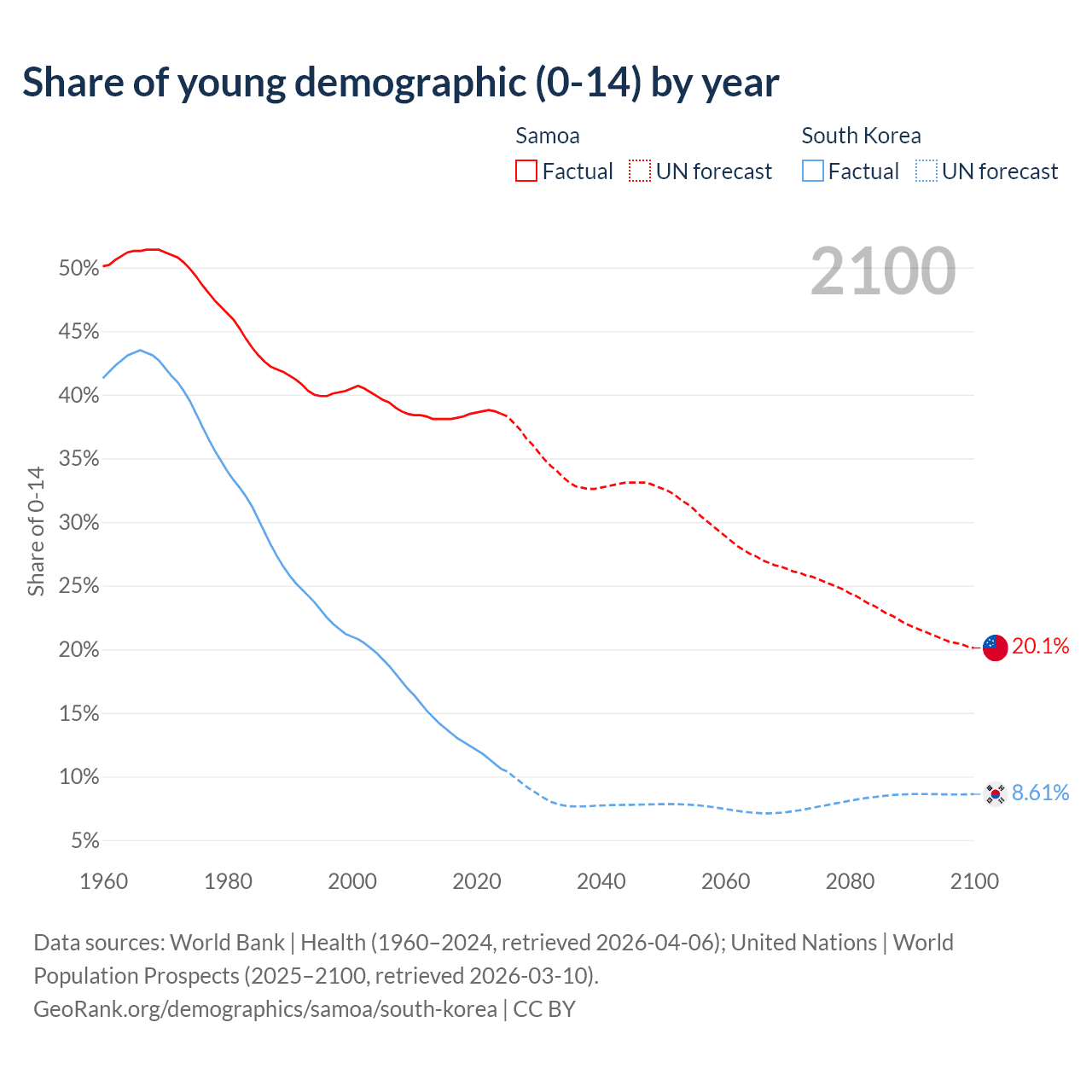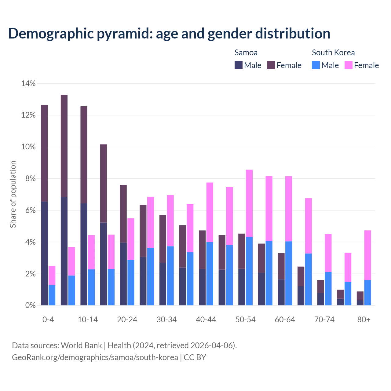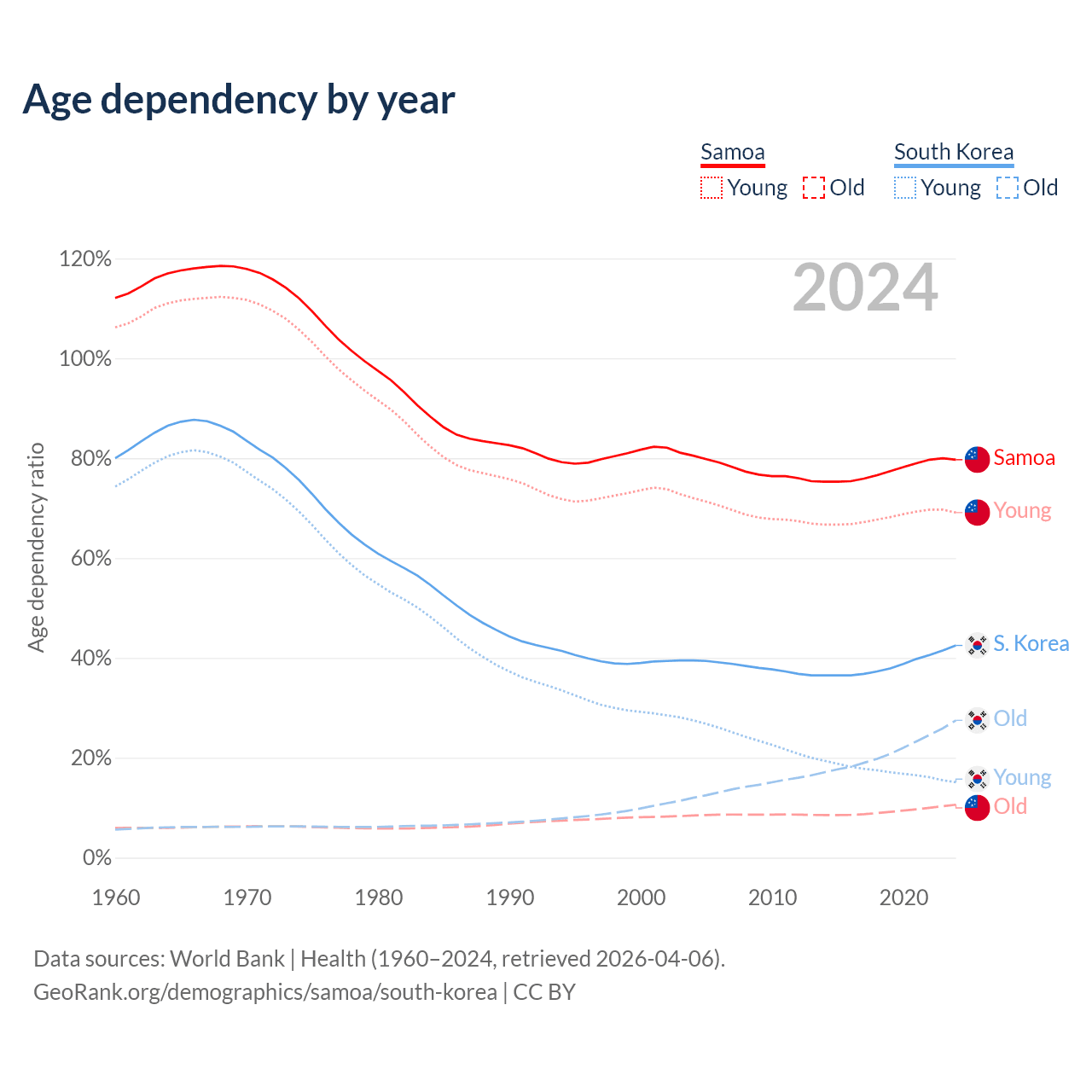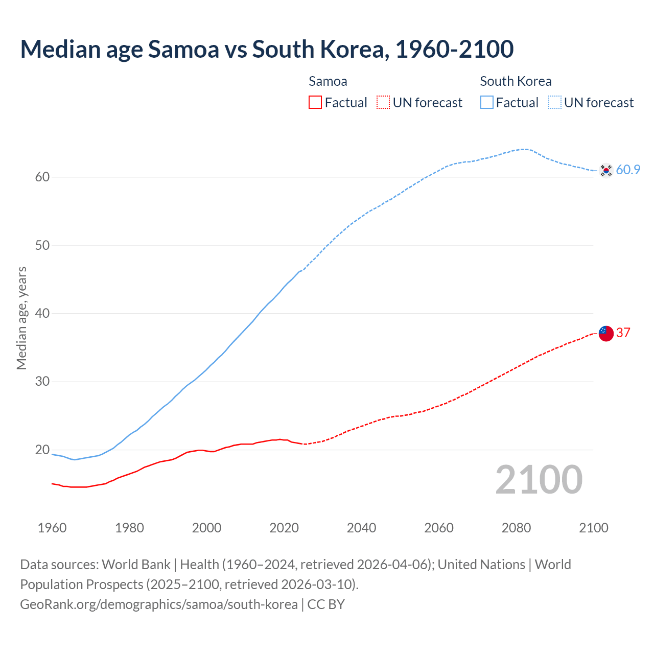 - Samoa is ranked 158/196 by median age (oldest to youngest) vs 10/196 for South Korea.