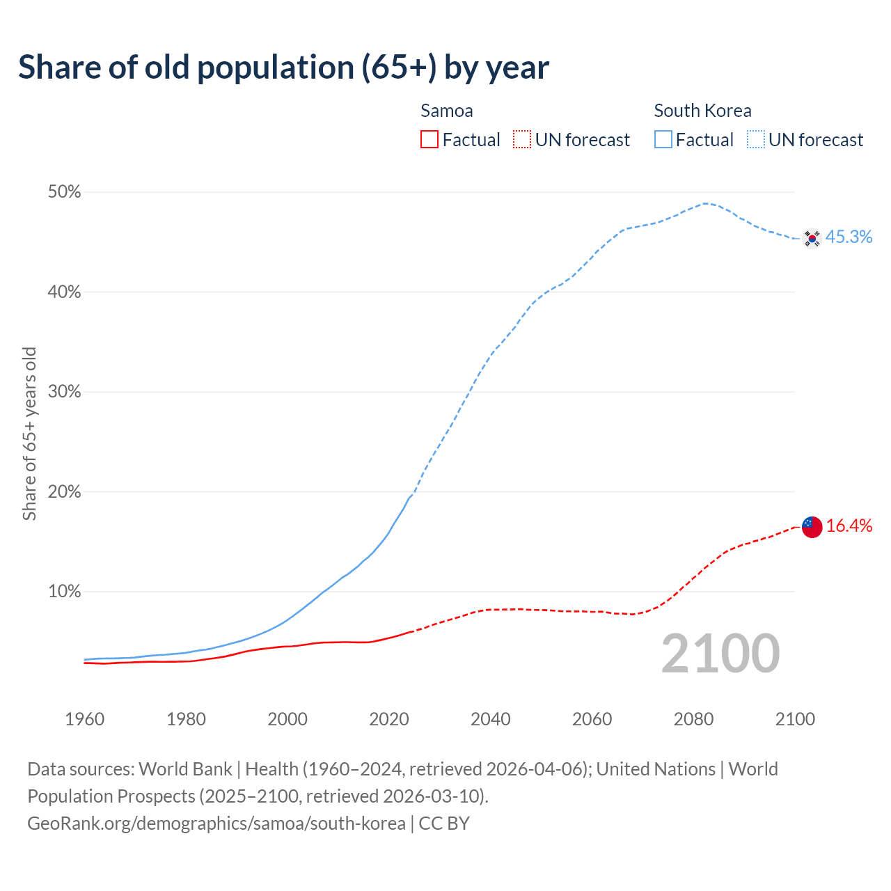 The share of older people aged 65 and over is 5.88% in Samoa and 19.3% in South Korea. Life expectancy in Samoa compared to South Korea .