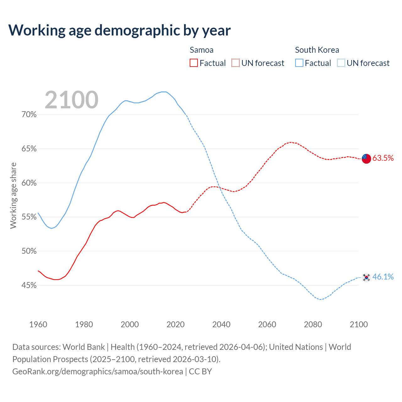 - Samoa has 123K working age adults (aged 15-64) vs 36.2M in South Korea.