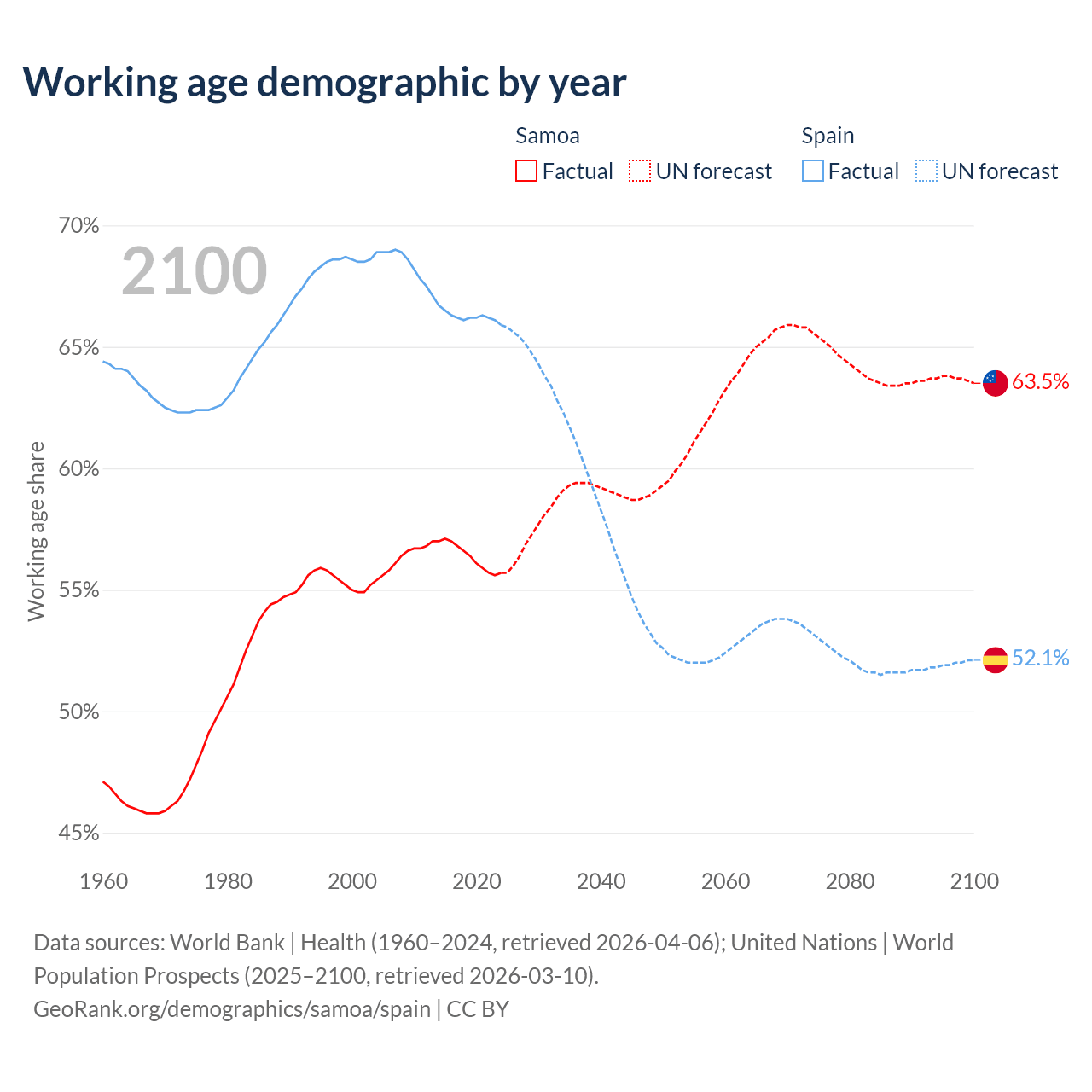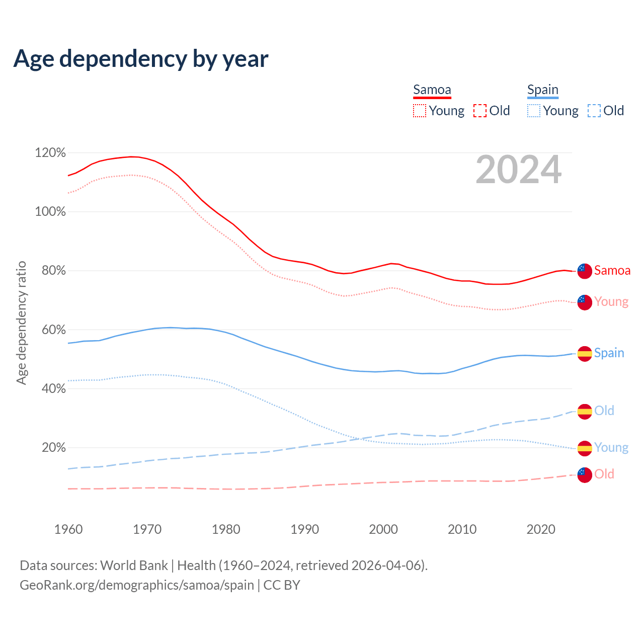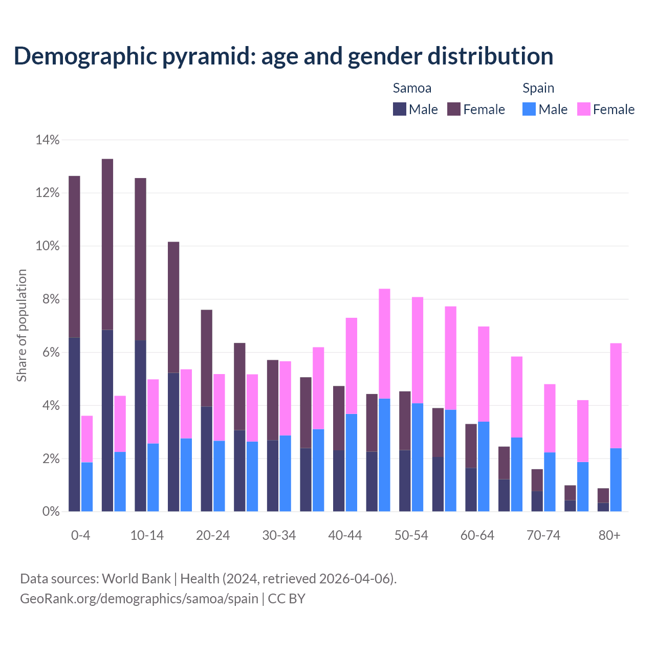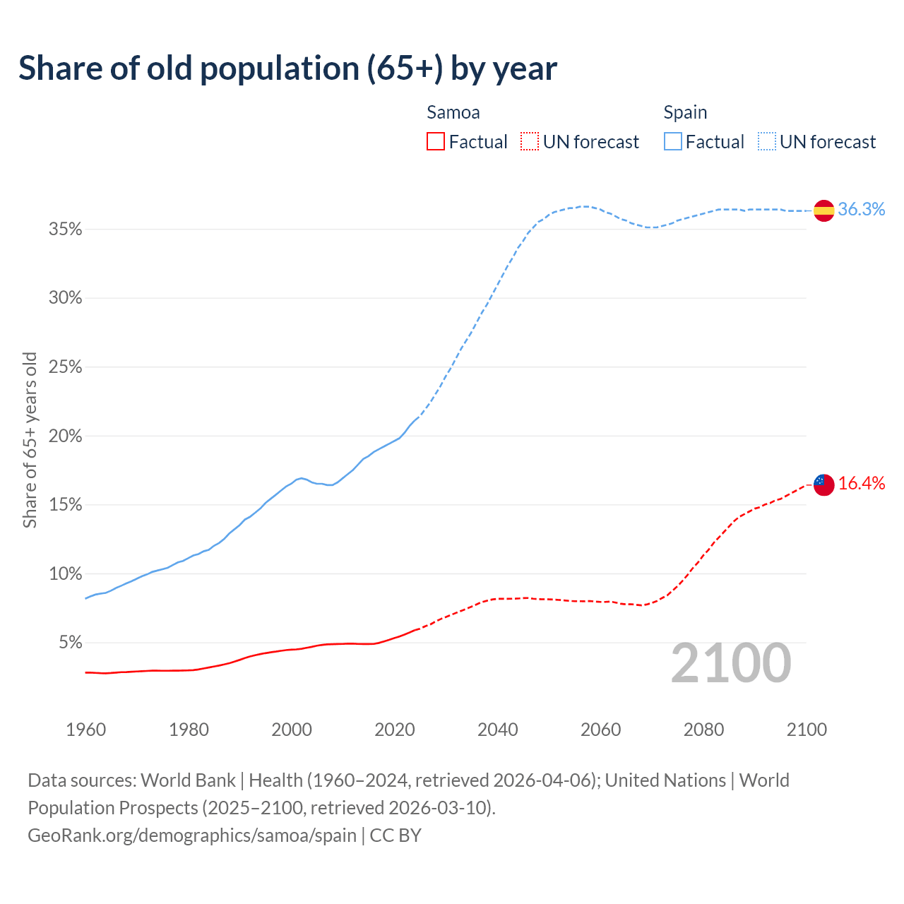 - The share of old-age demographic (65+) in Samoa is 5.88% vs 21.1% in Spain.