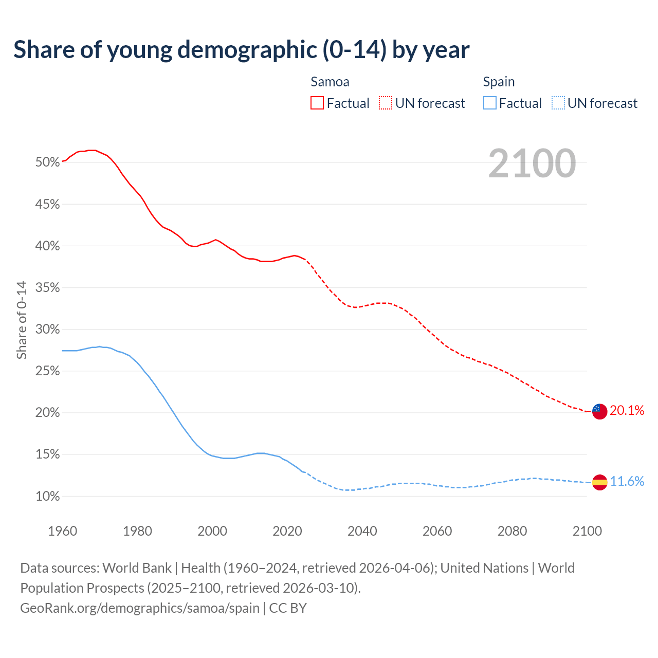 - The share of young demographic (0-15 years old) in Samoa is 38.5% vs 12.9% in Spain.