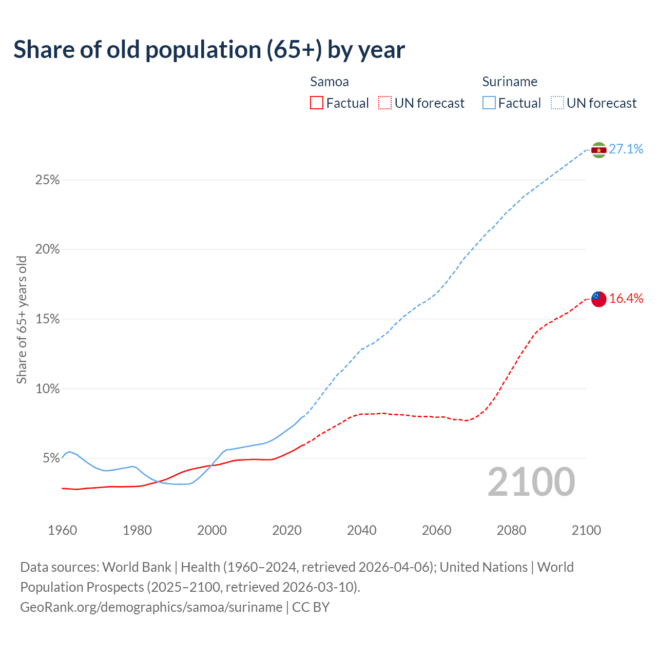 - The share of old-age demographic (65+) in Samoa is 5.88% vs 7.9% in Suriname.