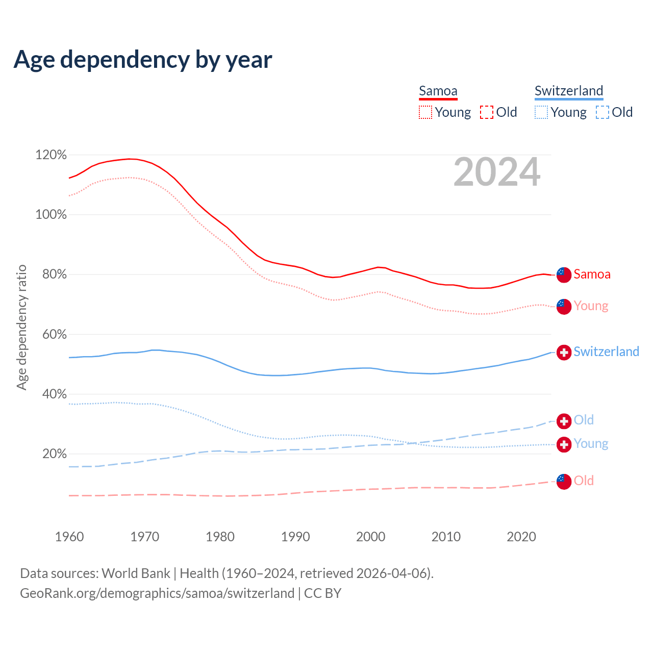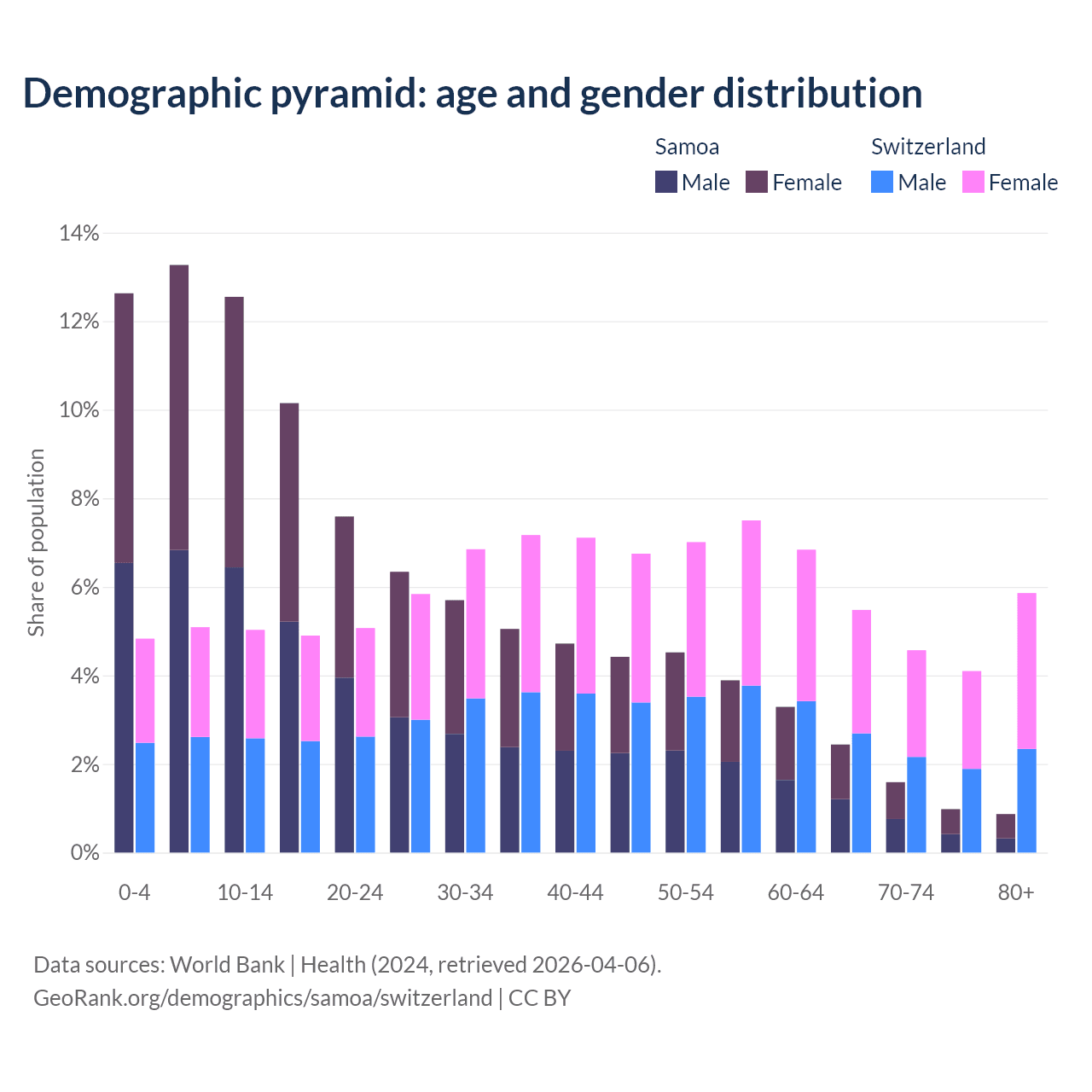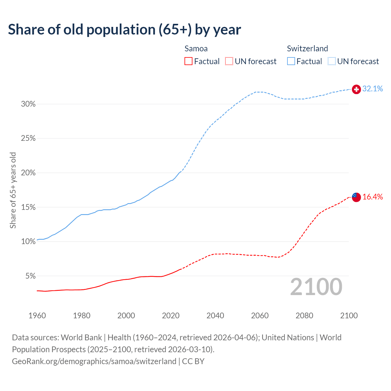 The share of older people aged 65 and over is 5.88% in Samoa and 20% in Switzerland. Life expectancy in Samoa compared to Switzerland .