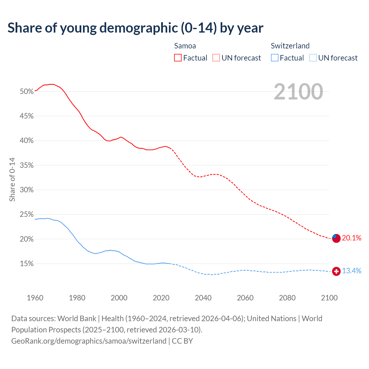 - The share of young demographic (0-15 years old) in Samoa is 38.5% vs 15% in Switzerland.