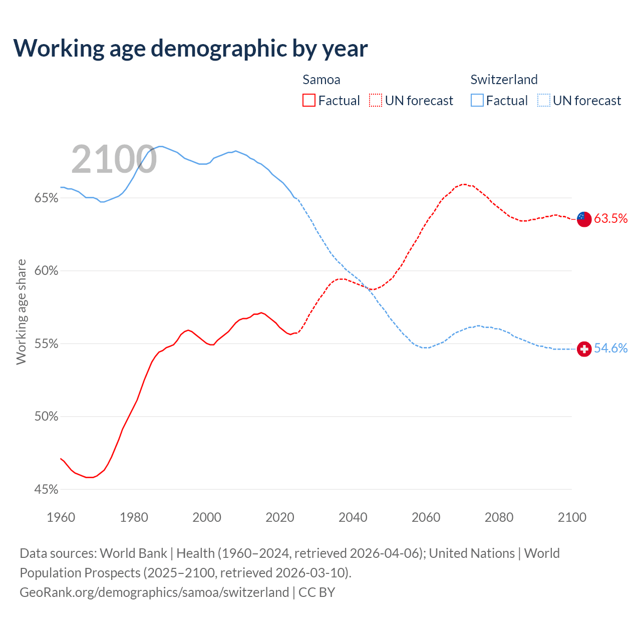 - Samoa has 123K working age adults (aged 15-64) vs 5.92M in Switzerland.