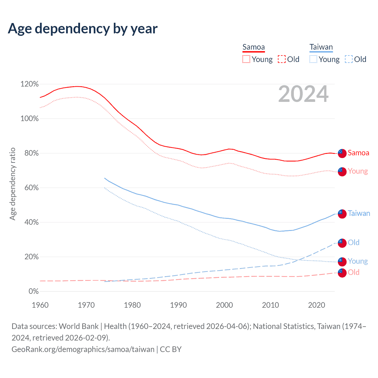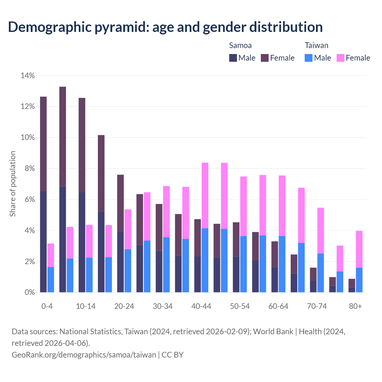 - Samoa is ranked 158/196 by median age (oldest to youngest) vs 16/196 for Taiwan.
