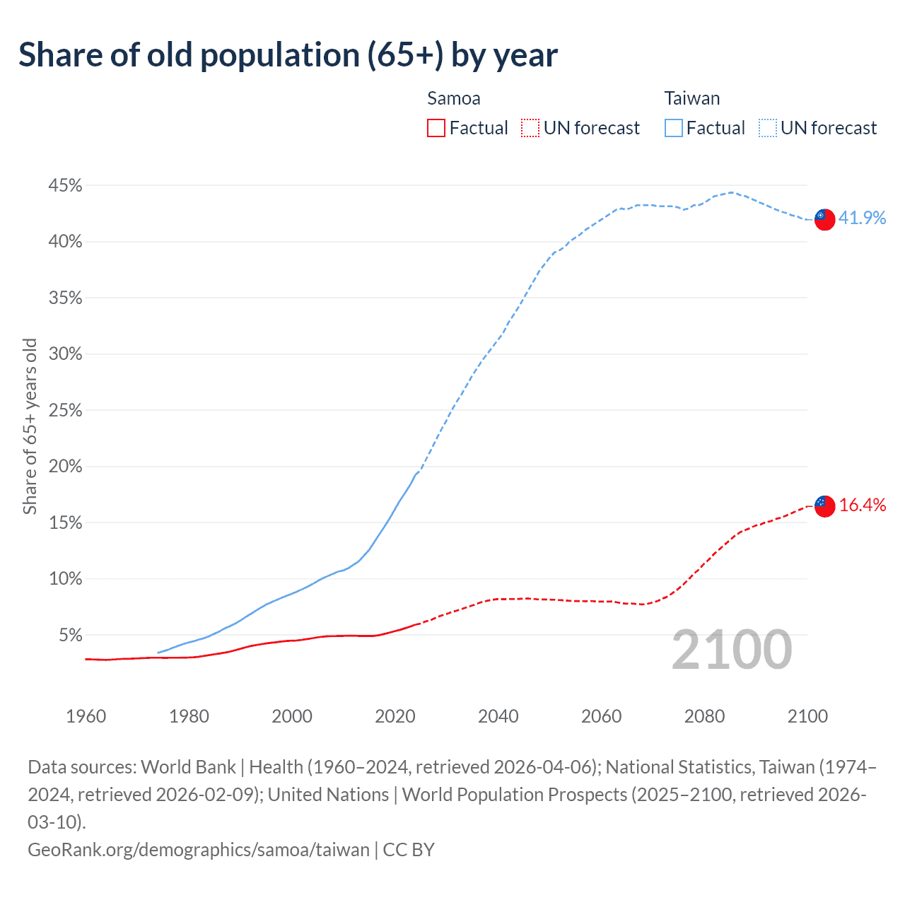 The share of older people aged 65 and over is 5.88% in Samoa and 19.2% in Taiwan. Life expectancy in Samoa compared to Taiwan .