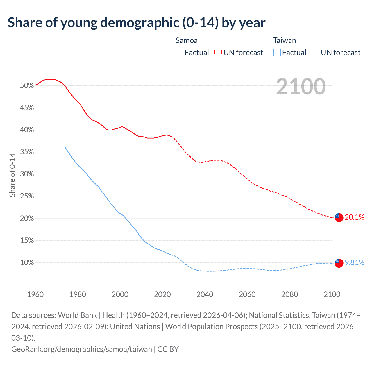 - The share of young demographic (0-15 years old) in Samoa is 38.5% vs 11.7% in Taiwan.