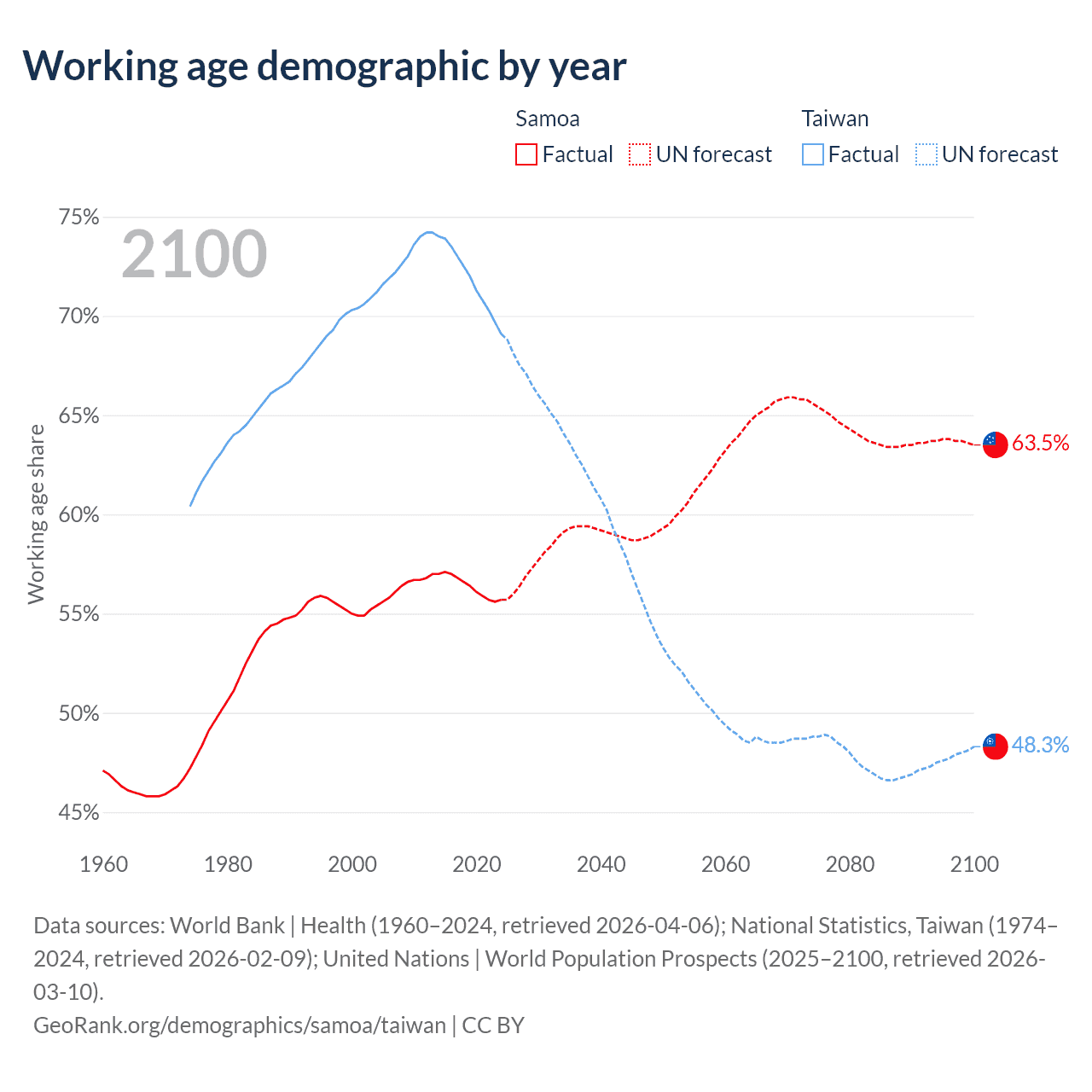 - Samoa has 123K working age adults (aged 15-64) vs 16.1M in Taiwan.