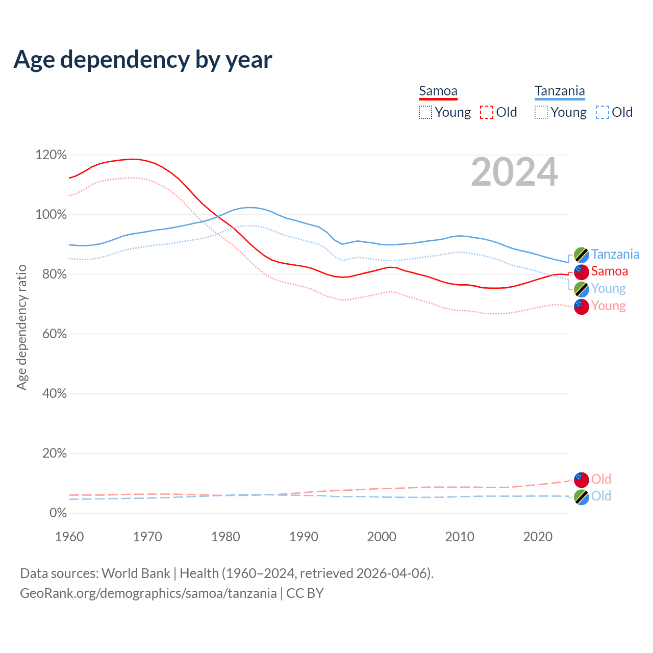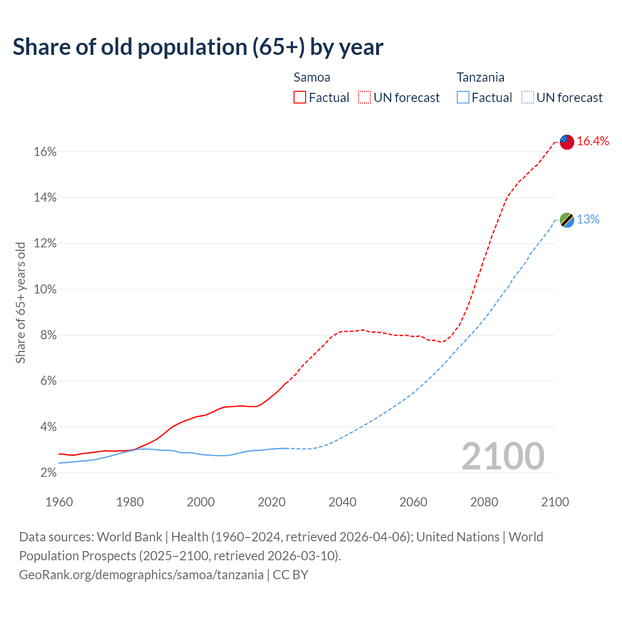 - The share of old-age demographic (65+) in Samoa is 5.88% vs 3.05% in Tanzania.