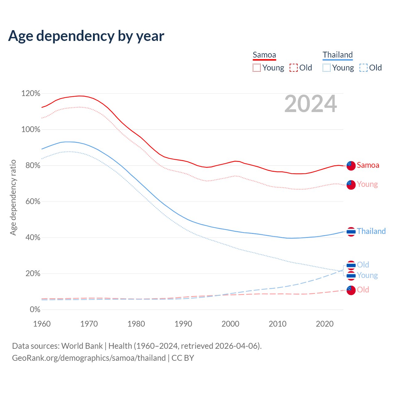 - Samoa is ranked 158/196 by median age (oldest to youngest) vs 40/196 for Thailand.