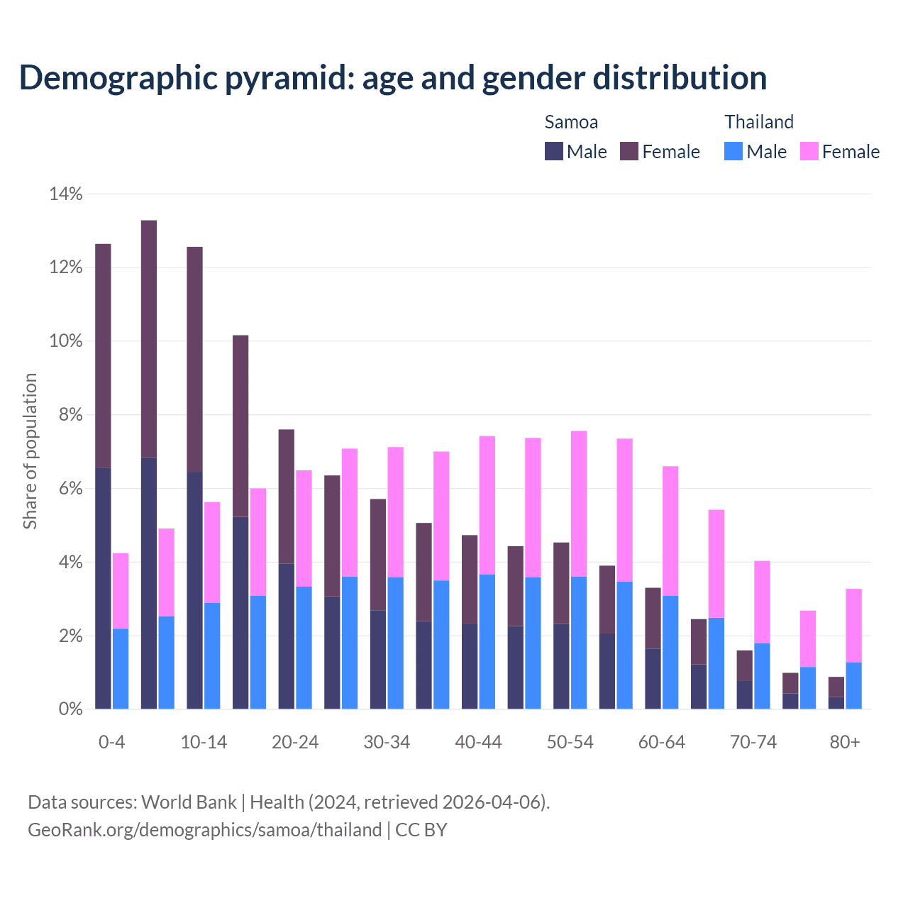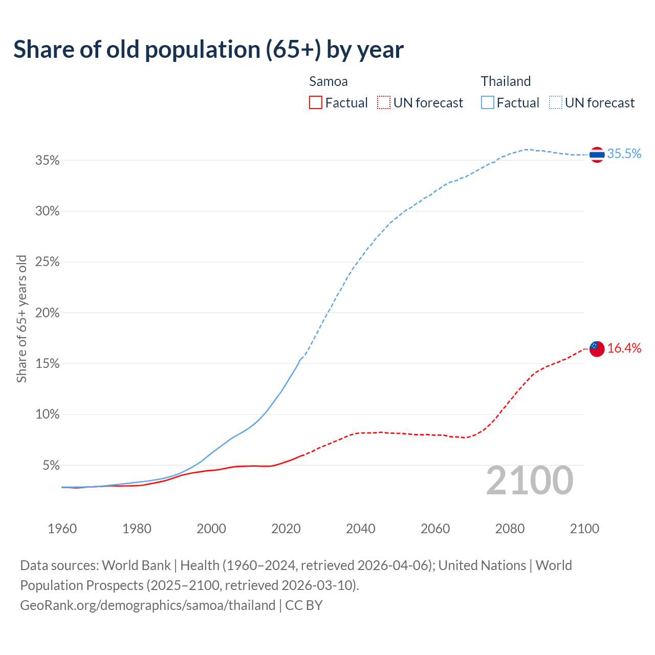 The share of older people aged 65 and over is 5.88% in Samoa and 15.4% in Thailand. Life expectancy in Samoa compared to Thailand .