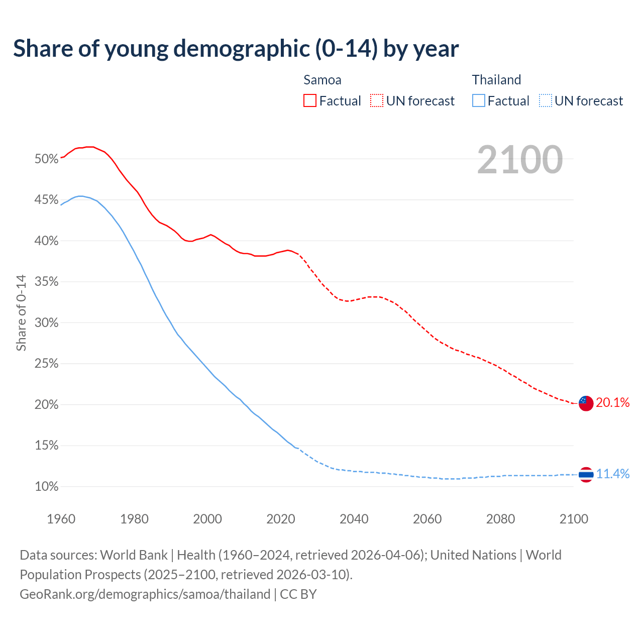 - The share of young demographic (0-15 years old) in Samoa is 38.5% vs 14.7% in Thailand.