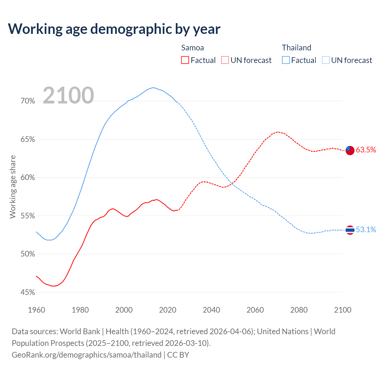 Median age Samoa vs Thailand, 1960-2100
