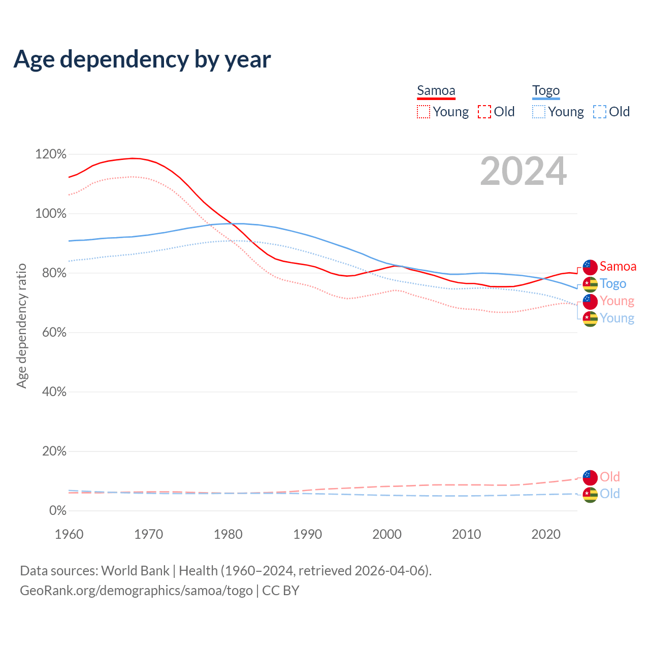 - Samoa is ranked 158/196 by median age (oldest to youngest) vs 166/196 for Togo.