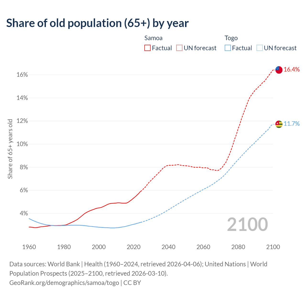 - The share of old-age demographic (65+) in Samoa is 5.88% vs 3.21% in Togo.